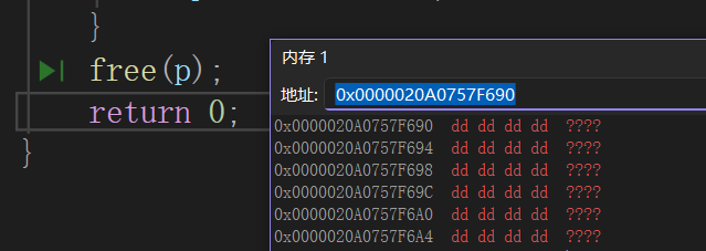 可以看到所有的空间的数据全部清空,但地址依旧没变,说明只是将空间的使用权限还给了操作系统,但p指向的指针还是原来的起始位置,这个时候p就指向的是野指针,而我们还要把野指针转化成空指针