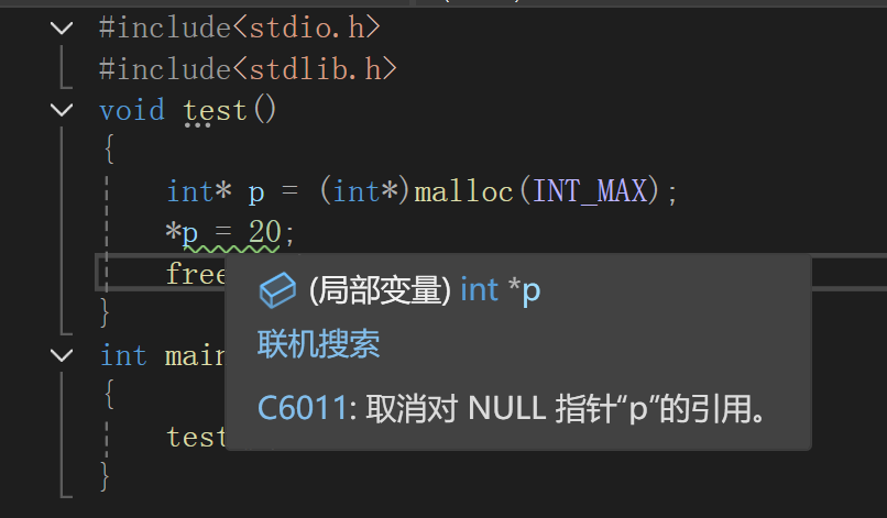 此时我申请了一块空间,但我没有对p进行判断是否为NULL,这个时候就很危险了,此时编译器就会出现警告,他怀疑p的地址为NULL