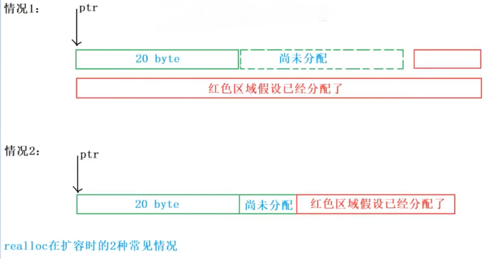 情况2:这就是剩余的空间不够扩大,这时就会在堆区中重新找一块空间开辟20个字节,然后将旧的数据拷贝一份过来在这块新开辟的空间前面,再释放掉旧的空间返回新的空间的起始位置,而之前旧的空间不需要手动释放,realloc会自动释放,如果最后开辟空间失败就会返回NULL
