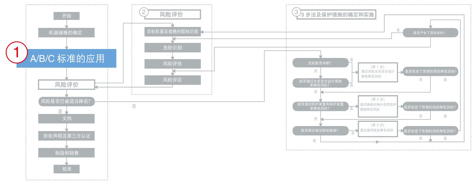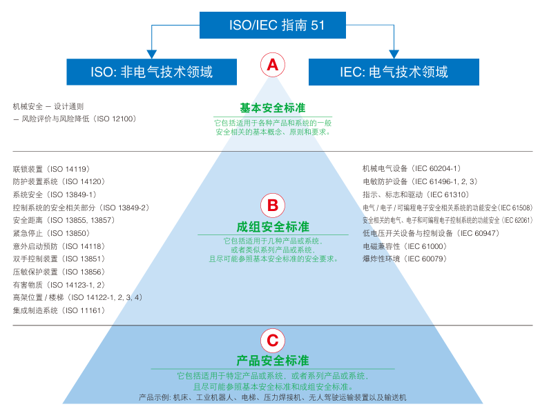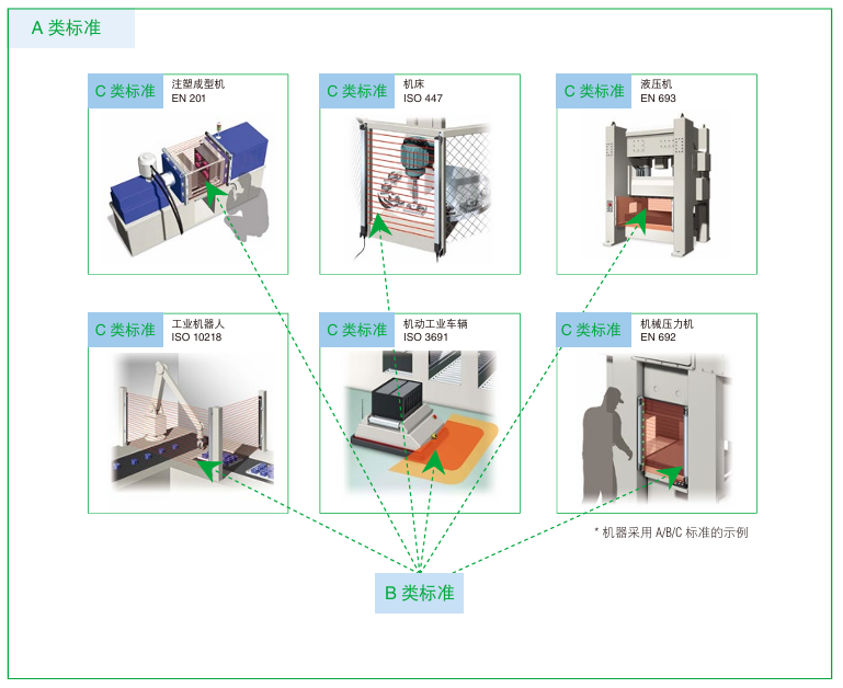 在确定适用的安全标准时,如果已制定C类标准,则机器必须适用C类标准 。如果C类标准尚未制定,或者现有C类标准不足以降低风险,则应适用A类或B类标准。
