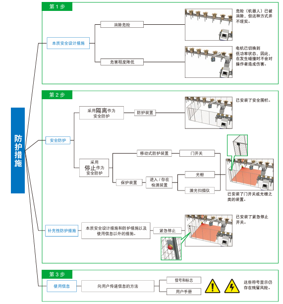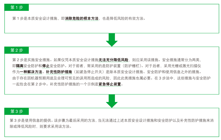 根据优先顺序,这些措施可排列为1、2和3。应按照下列程序(称为3步法及防护措施)来实施这些措施。