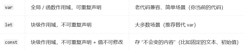 var 是 JavaScript 中用来声明变量的一个关键字,除了 var 还有 let 和 const