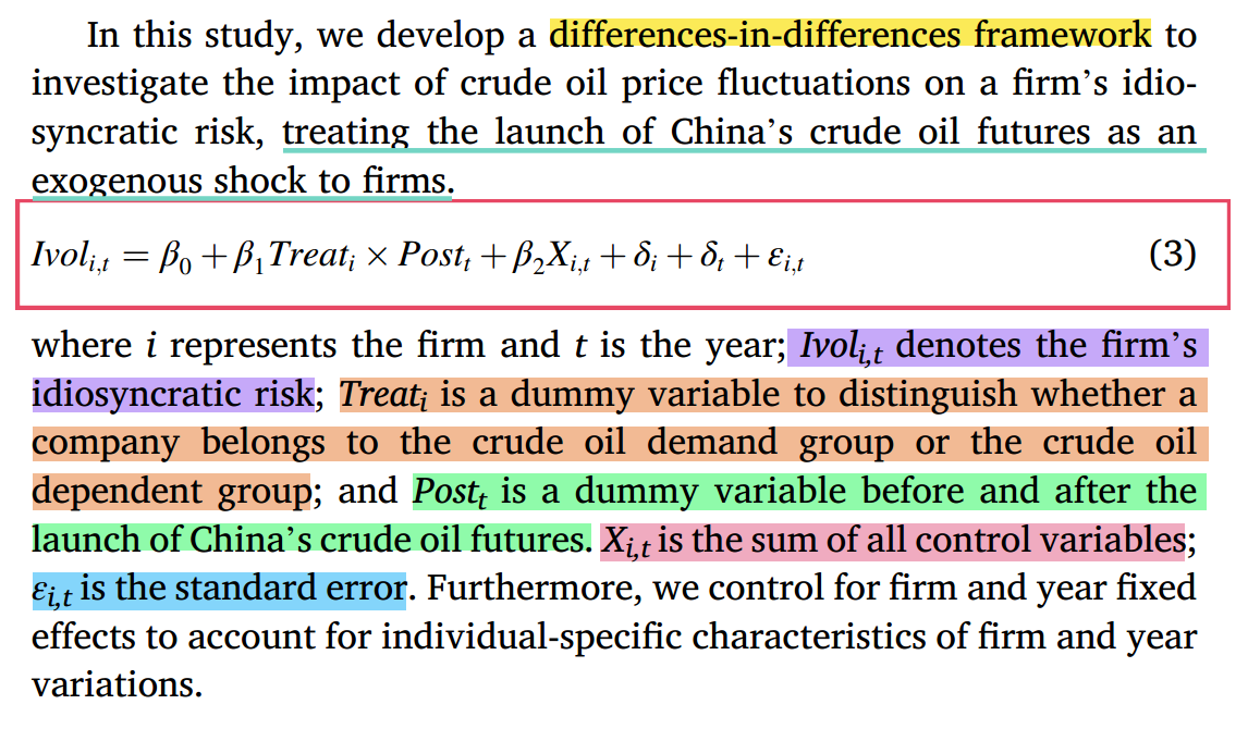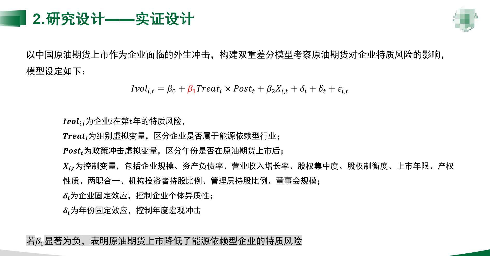 【文章做了什么?如何做的?结果如何?】 文献表明,中国在上海国际能源交易所(INE)推出 COF 合同后,大多数中国公司都持有包含SC的投资组合。结果表明,原油期货波动率与上市公司股票表现之间的关系具有明显的行业特征。因此,我们采用公司特质波动率(反映公司特定的私人信息或噪音交易)来衡量公司的风险管理,以研究中国的 COF 对其的影响。我们采用双重差分 (DID) 方法研究了 2014 年至 2021 年期间持有 SC 合同对公司风险管理的影响,其中我们认为 2018 年中国 COF 的正式上市是一种外生事件冲击。实证结果表明,中国 COF 的推出显著降低了依赖能源的中国公司持有上海原油期货 (SC) 时的特殊风险。我们的结果表明,使用原油期货进行对冲可以有效降低与原油现货交易相关的交易风险,使 SC 持有有利于企业风险管理。基准回归结果的稳健性通过一系列测试得到证实,包括平行趋势检验、预期效应检验、倾向得分匹配、熵平衡匹配、安慰剂检验、替代特质风险计算、控制多维固定效应和研究样本的调整。机制测试进一步表明,持有 SC 的能源依赖型公司通过内部和外部渠道减轻特殊风险。中国投资者通过在内部现金渠道内进行对冲来稳定内部融资并降低价格风险。在外部信息渠道方面,中国 COF 的推出增加了投资者对能源依赖型企业的关注。此外,COF 产生的利好消息减少了投资者的看法异质性,使信息来源多样化,并减少了个股交易的噪音。