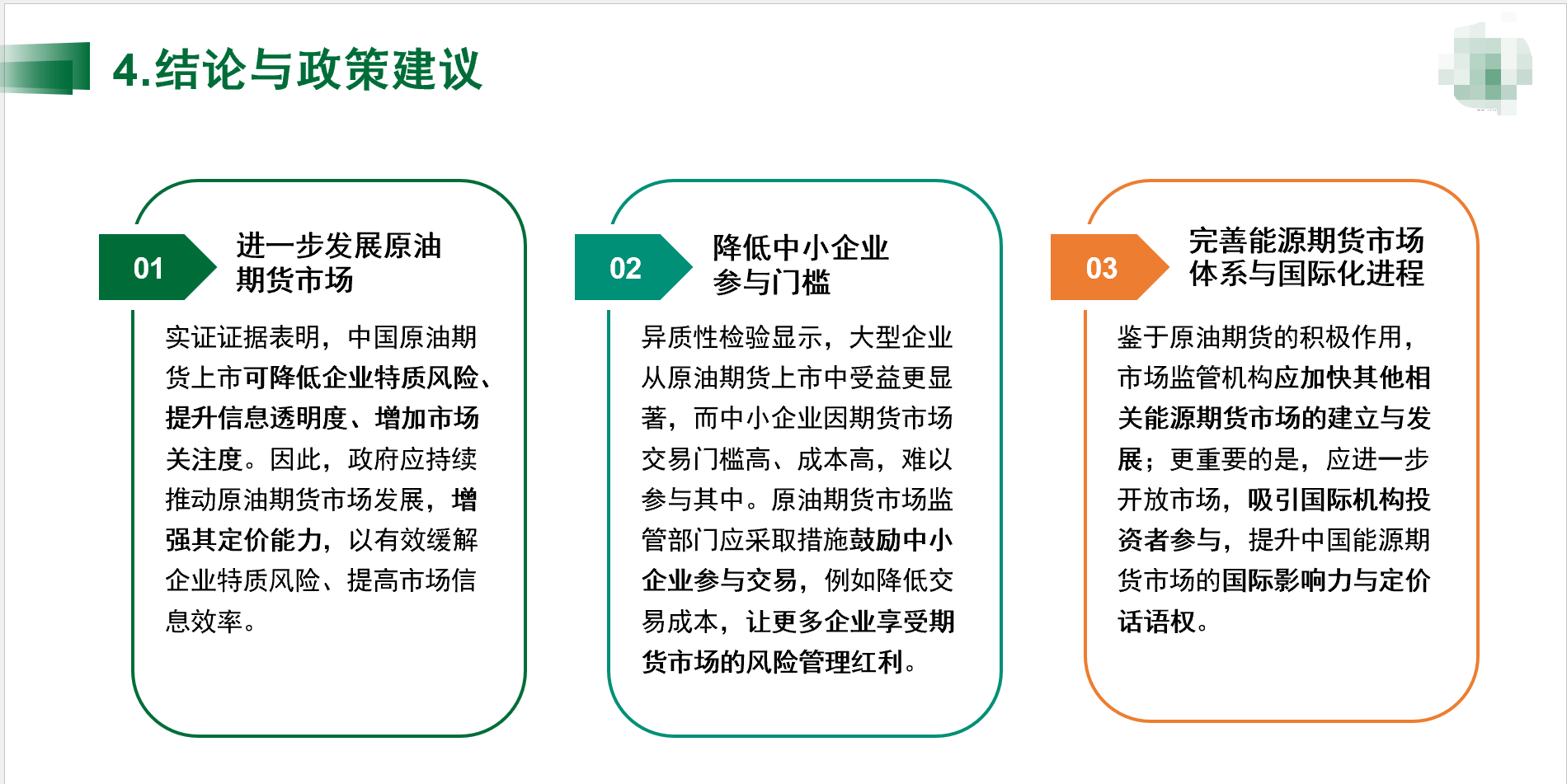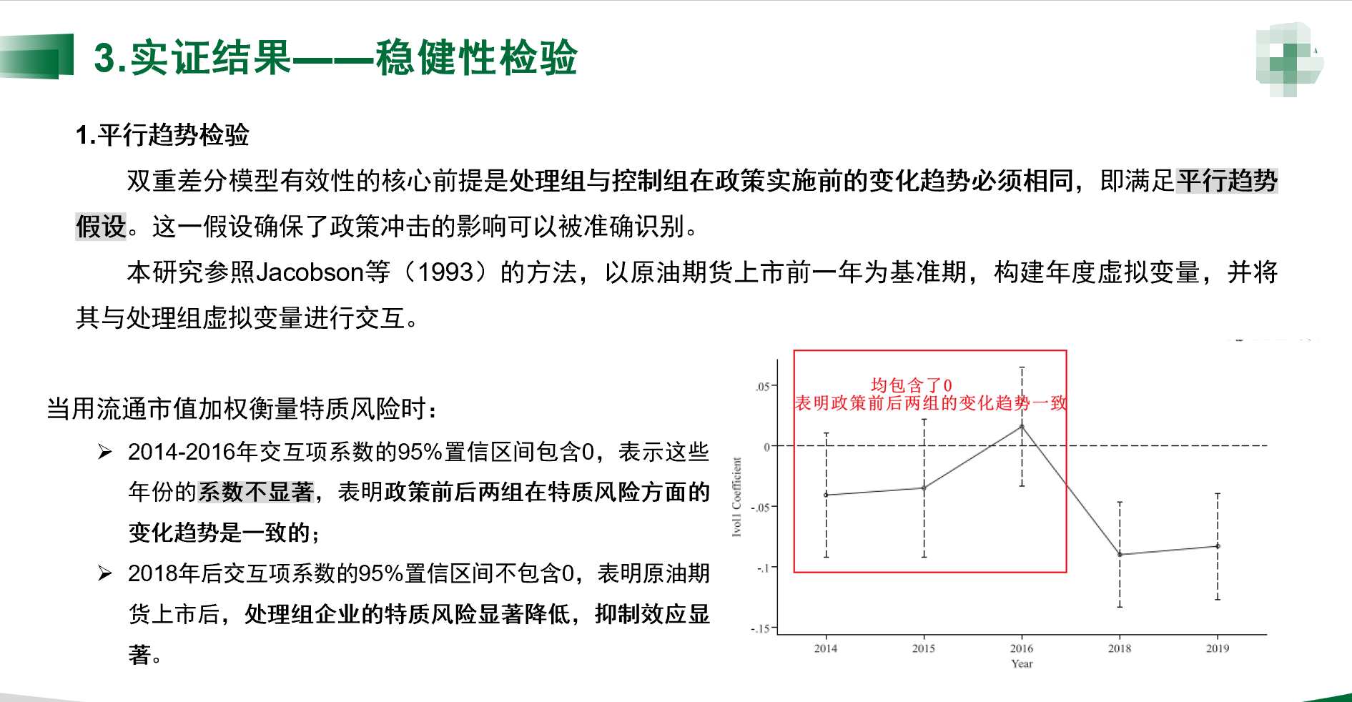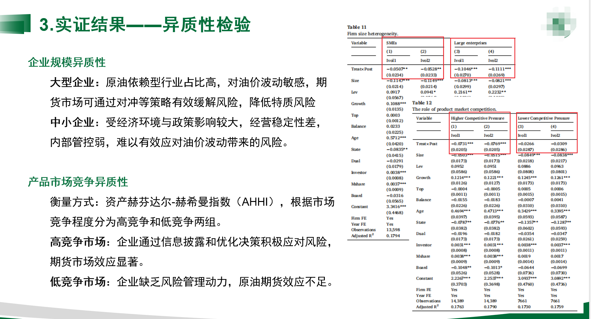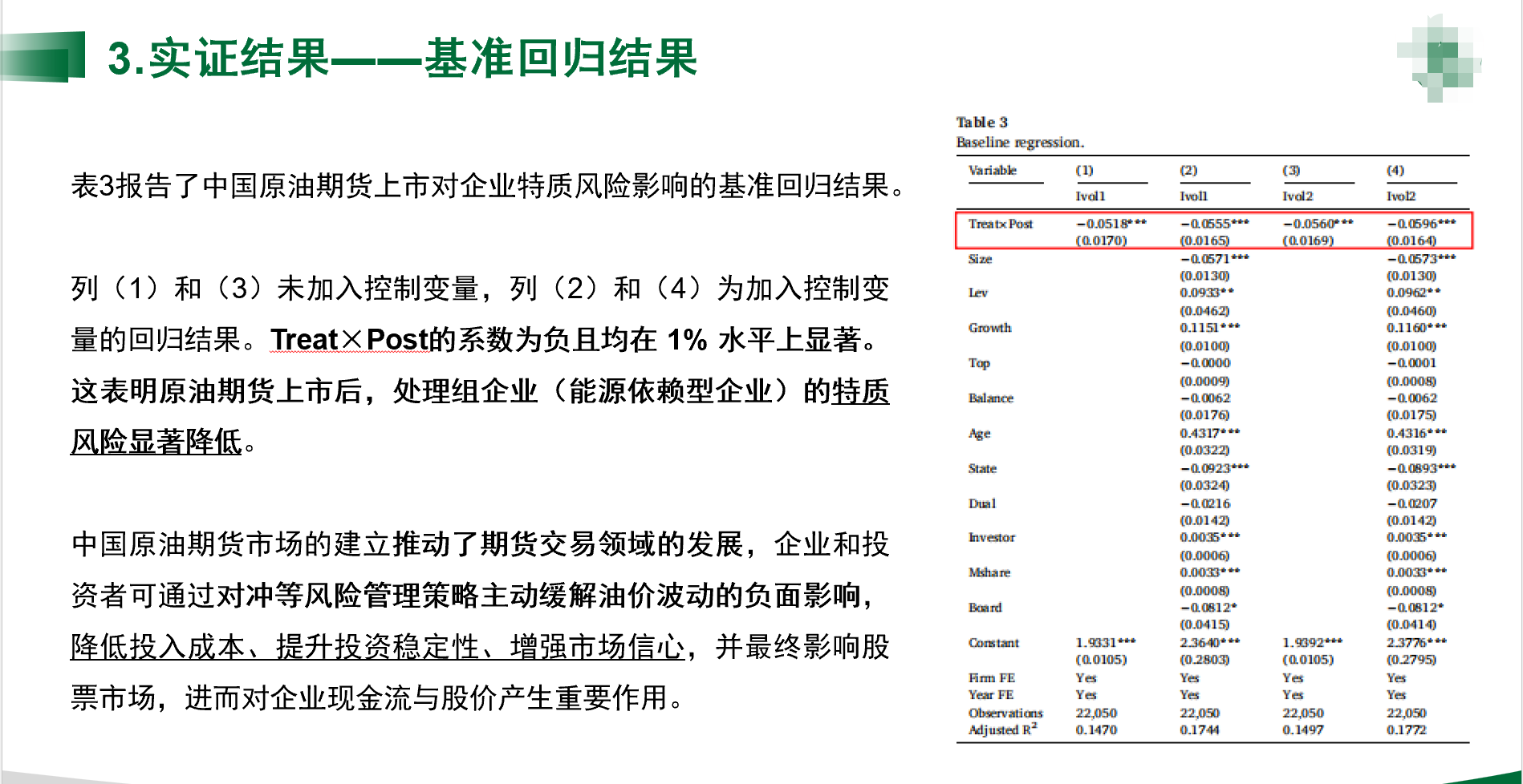 (2)研究有助于企业对冲行为(corporate hedging behavior) 相关的文献,特别是关于管理公司的特殊风险。以往对企业特质风险的研究主要集中在公司内部治理方面 ,包括企业社会责任, ESG披露,绿色创新战略和企业战略重点。我们从风险管理的角度来研究公司对冲行为的影响,考察其对股票市场中公司特质信息的影响。这为原油期货交易公司的影响提供了间接证据。
