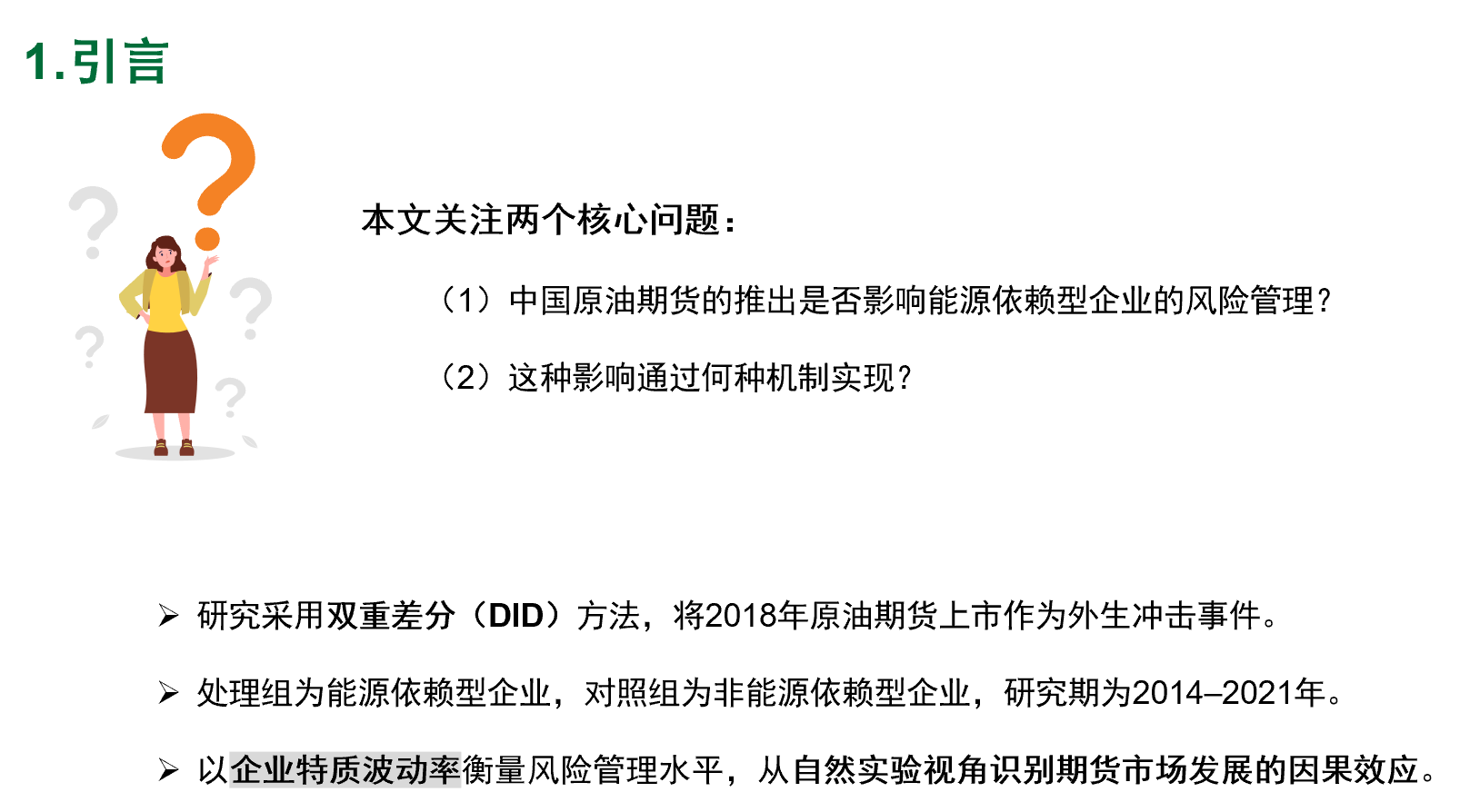 套期保值比率的概念起源于现代投资组合的均值与方差理论 。Johnson(1960)和Stein(1961)进一步完善了现货与期货之间的数学模型测量。大量研究采用时间序列计量经济学方法估算现货与期货之间的套期保值比率,表明两者之间存在一定程度的相关性。原油是世界上最重要的能源之一,与能源相关企业的经营和发展密切相关。合理利用期货等金融衍生品进行风险管理是必不可少的。 已有研究探讨了期货市场的价格发现功能、波动溢出效应及其预测能力。SC合约不仅为投资者提供了一种对冲机制,以降低现货价格风险,而且为中国企业在当地开展业务提供了便利,有效地保护了它们免受外汇市场波动的影响。Wu et al .(2022)指出,SC在两两对冲下比WTI和Brent具有更高的对冲有效性。此外,他们使包含SC的投资组合优于其他投资组合。【引出本文内容 】因此,我们主要关注中国企业层面的两个问题:(1)中国原油期货的推出对能源依赖型企业的风险管理有何影响?这种影响的具体机制是什么?