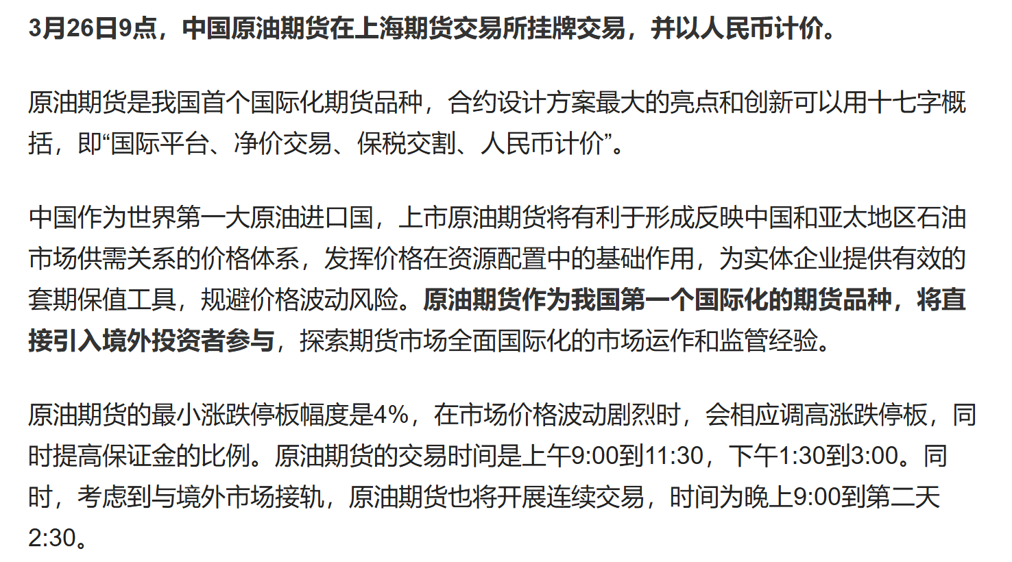 美国纽约商品交易所的西德克萨斯原油期货(WTI)和英国伦敦洲际交易所的布兰特原油期货(Brent)分别是北美和欧洲的基准原油期货。这两个合约占全球交易量的95%以上,对全球原油价格具有重要影响。根据《BP世界能源统计年鉴》,2021年,北美和欧洲在全球原油消费量中的占比分别仅为23.7%和14.4%,而亚太地区在全球原油消费量中的占比则飙升至38.1%。尽管亚太地区的消费份额大致相当于北美和欧洲的总和,但没有成熟的期货市场为原油交易提供定价基准和风险缓解工具。WTI和Brent原油期货定价对亚太地区的影响可以忽略不计,包括中国在内的亚太地区国家在进口原油时面临"亚洲溢价"。这一现象导致中东地区进口原油的价格明显高于同一地区同等品质的欧美国家,导致消费成本大幅上升。