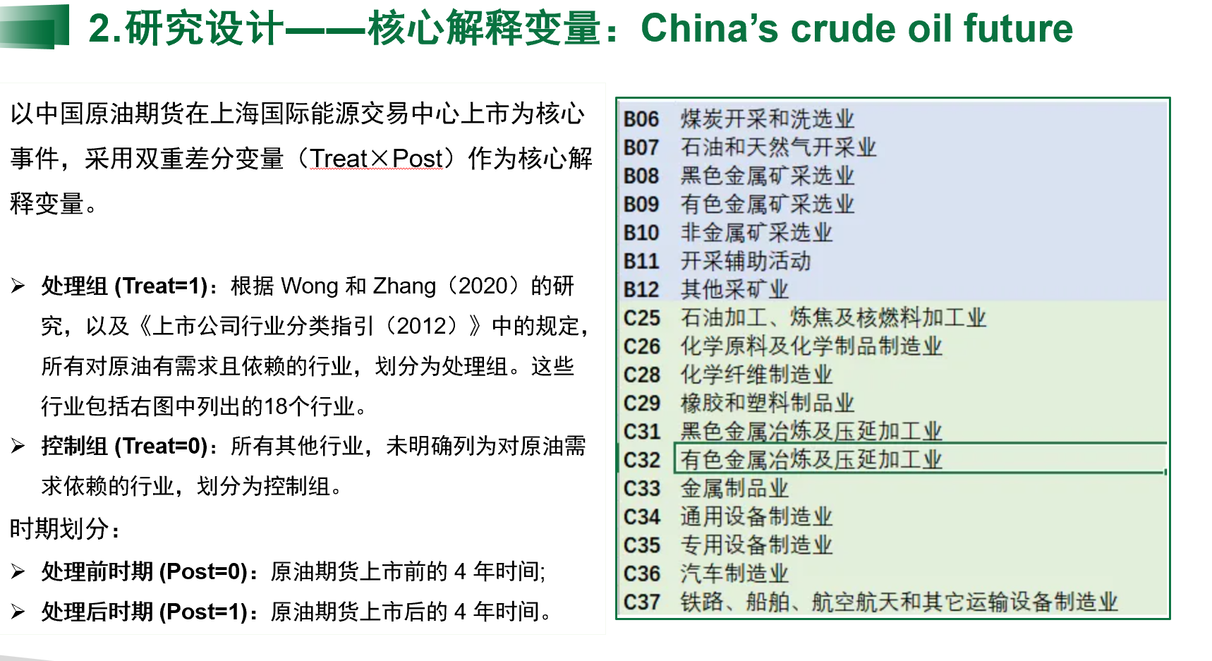 核心解释变量X :We consider China's crude oil futures launch at the Shanghai International Energy Exchange as the pivotal event and utilize differences-indifferences, denoted as Treat×Post, as the core explanatory variable