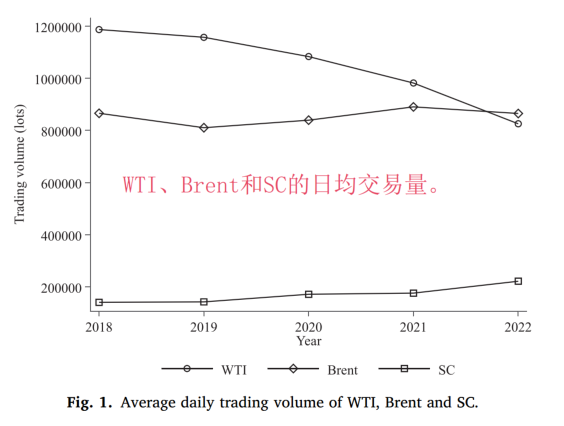 中国是世界上最大的原油进口国之一,自2013年超过美国以来,原油依赖度 已达到55.2%。根据国家统计局的数据,到2021年,这一比例已上升至72%。中国原油期货需求的增长和在原油定价体系中相对薄弱的影响力都推动了中国原油期货合约的建立。 经过中国政府数年的准备、规划和讨论,以人民币计价的原油期货合约上海原油期货(Shanghai crude oil futures, SC)于2018年3月26日在上海国际能源交易所(INE) 正式开始交易。此后,SC的交易量持续增长,在短时间内超过 阿曼原油期货合约(Oman crude oil futures) ,成为全球第三大原油期货交易合约。图1显示了2018-2022年WTI、Brent和SC的日均交易量。布伦特原油的交易量每年都保持相对稳定。