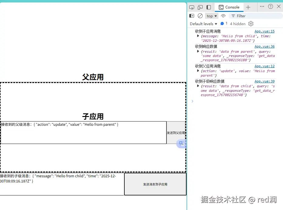 php// 子级向父级主送发送数据 send('child_message', { message: 'Hello from child', time: new Date().toISOString() });ini// 父级接收子级发来的数据。 on('child_message', data => { receivedData.value = data; console.log('收到子应用消息', data); }); // 收到子应用消息 {message: 'Hello from child', time: '2025-12-30T08:23:38.850Z'}