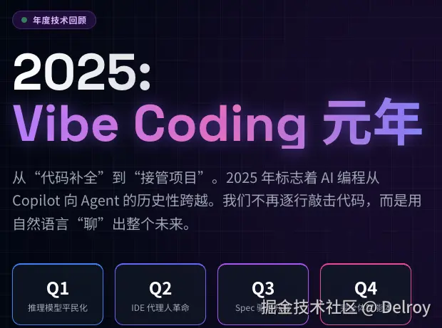 这不仅是 Vibe Coding 元年,更是 AI 编程技术生态大爆发的一年:推理模型平民化、Agentic IDE 崛起、Spec 驱动开发成型。让我们回顾这一年的关键技术节点,看看 Vibe Coding 如何重塑软件开发的未来。