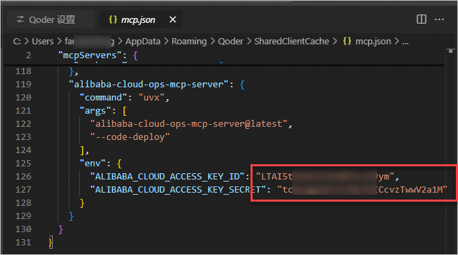 在 Qoder 的 MCP 配置中添加 阿里云 AccessKey(AK/SK)。