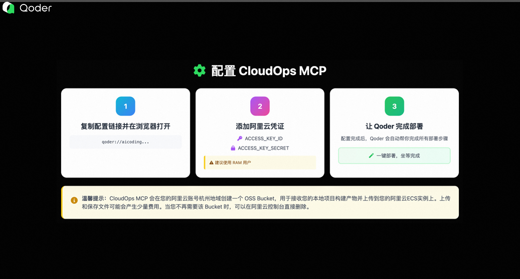 在浏览器中打开该链接,Qoder 会自动引导你配置 CloudOps MCP。