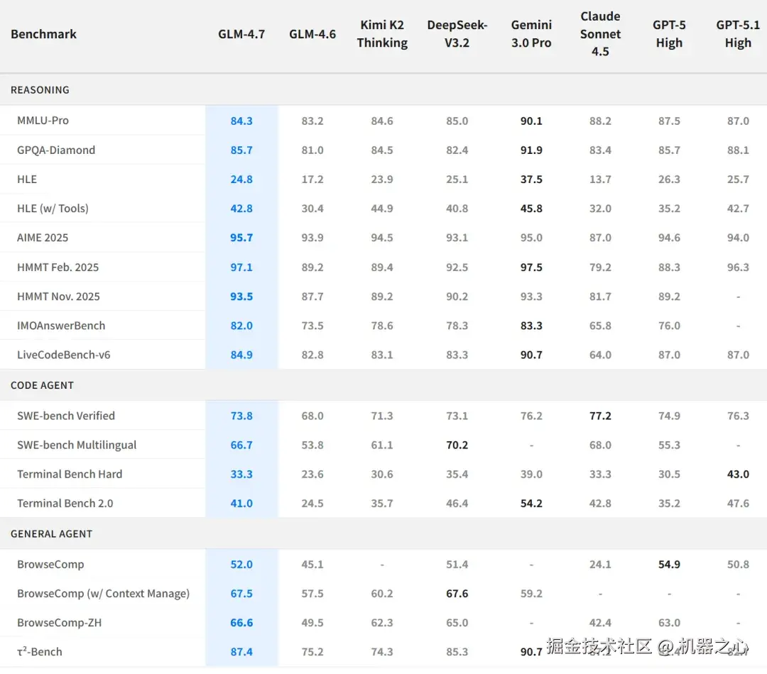 与 GPT-5、GPT-5.1-High、Claude Sonnet 4.5、Gemini 3.0 Pro、DeepSeek-V3.2、Kimi K2 Thinking 相比,GLM-4.7 也表现出色:
