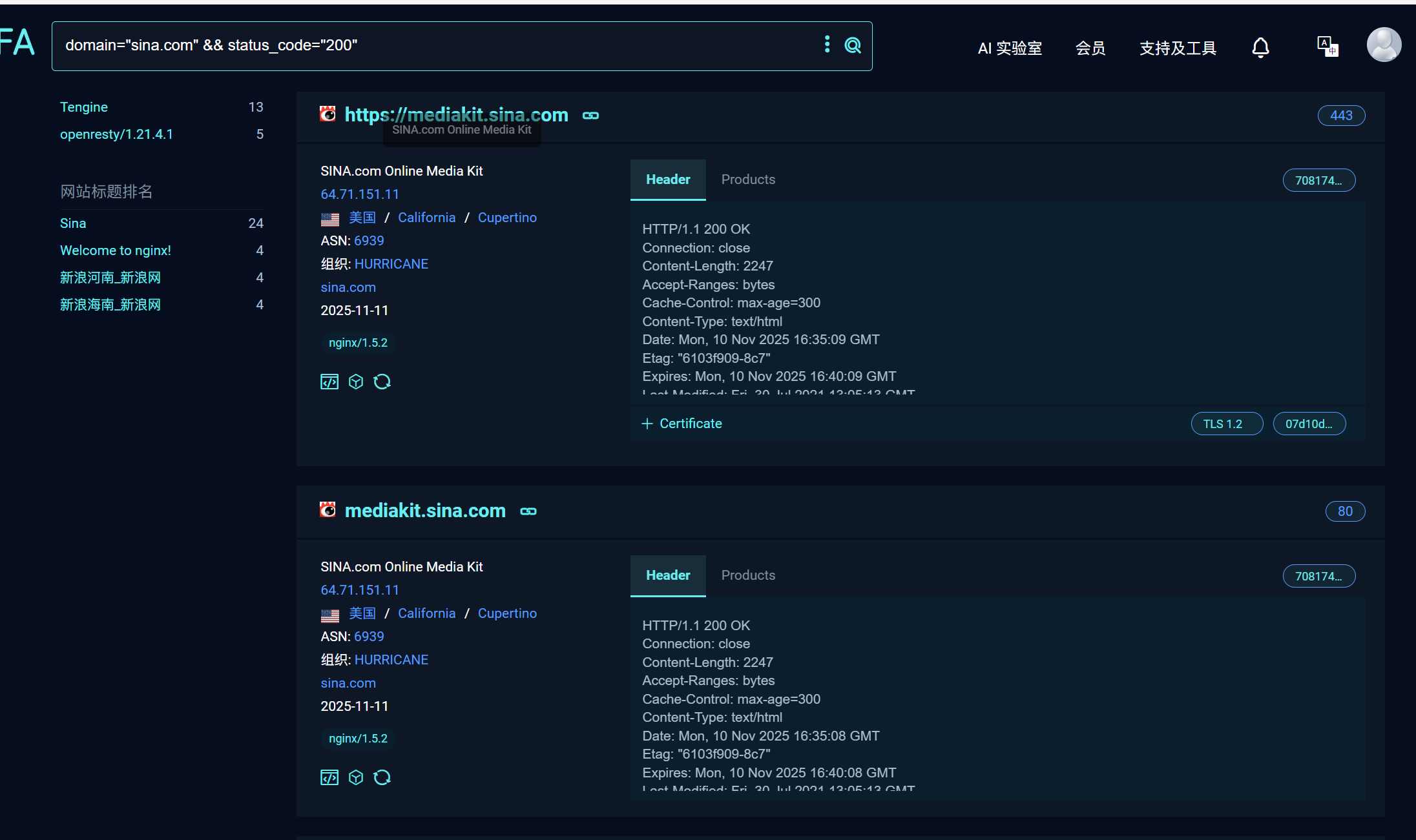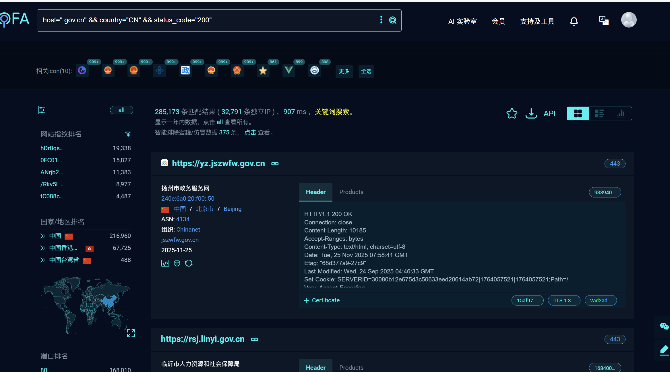 比如仅需收集能正常访问(状态码 200)的子域名,可用domain="example.com" && status_code="200";若只想获取部署了 Nginx 服务的子域名,语法为domain="example.com" && server="Nginx";要是需限定国内的子域名资产,可加上地域筛选domain="example.com" && country="CN"。