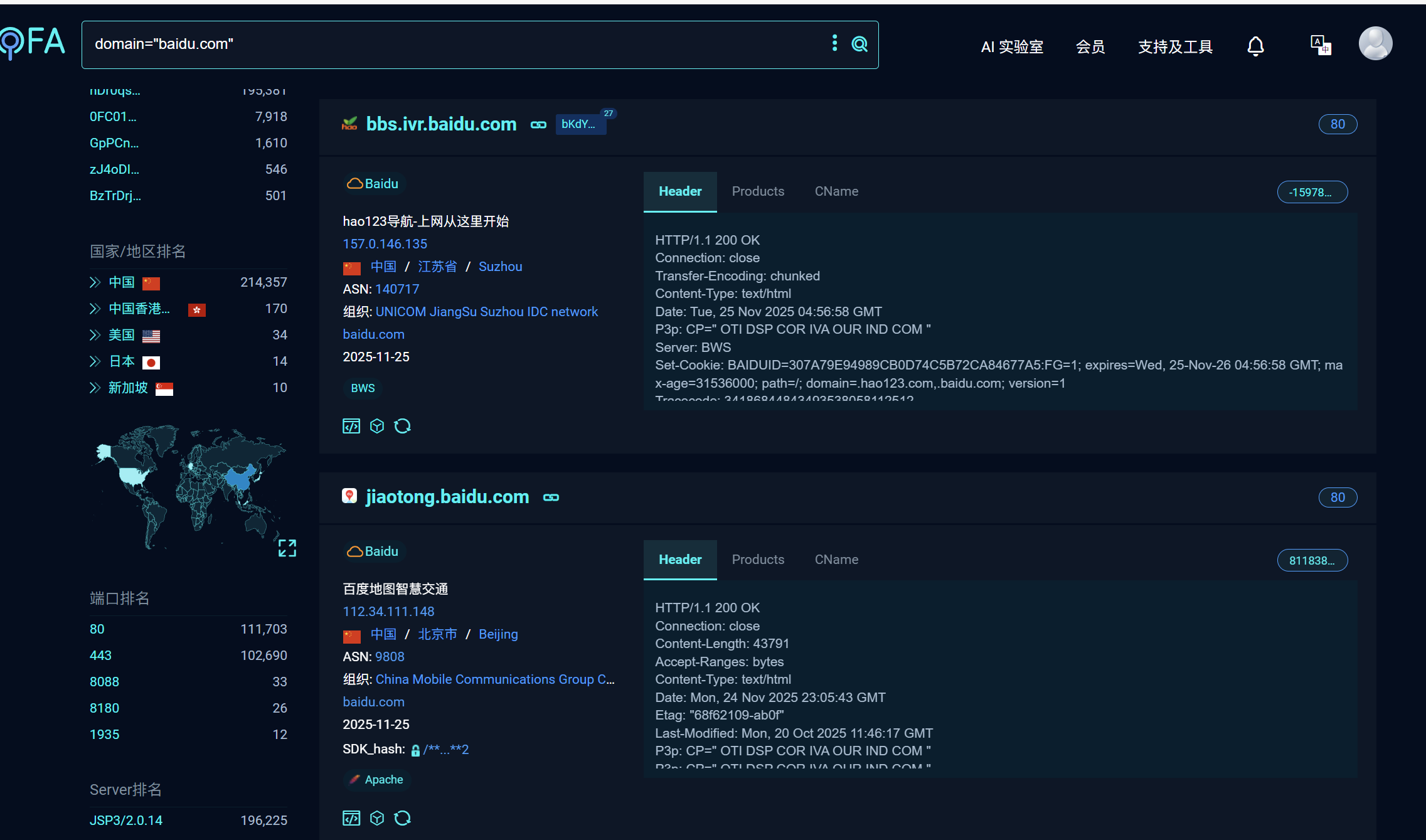 比如要收集baidu.com的子域名,在 FOFA 搜索框输入domain="baidu.com",就能获取该主域名下的各类子域名资产,像www.baidu.com、map.baidu.com等。若需收集多个主域名的子域名,可用||拼接语法,例如domain="a.com" || domain="b.com"。