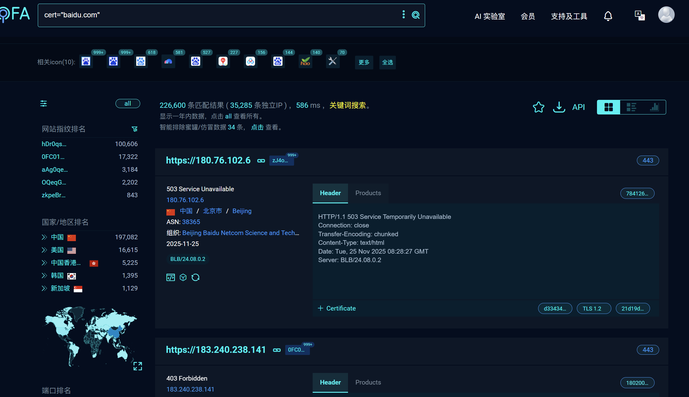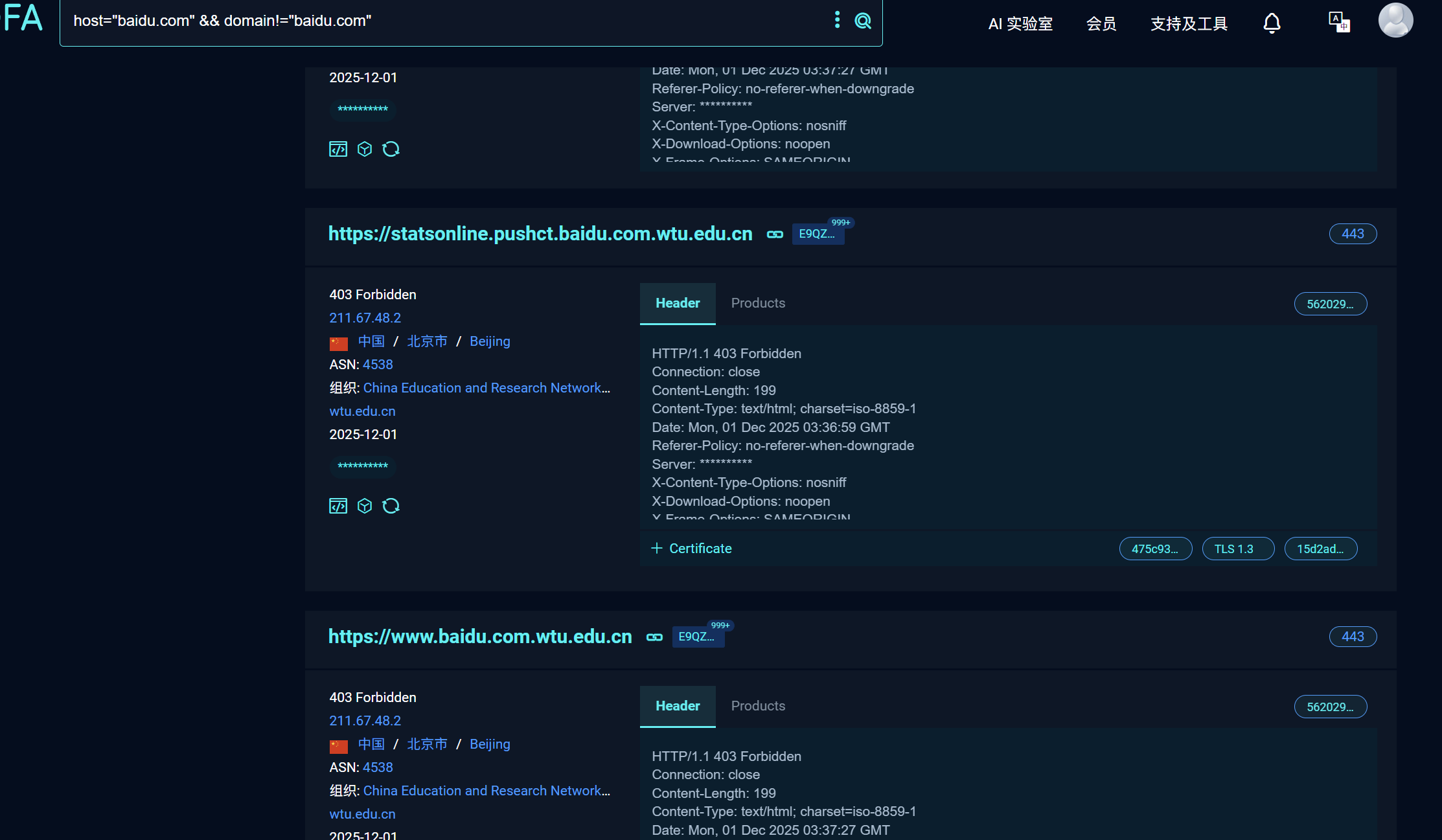 输入host="baidu.com",除了baidu.com的子域名,还可能返回与该域名相关的关联主机名资产。若想排除根域名仅保留子域名,可组合语法host="baidu.com" && domain!="baidu.com"。