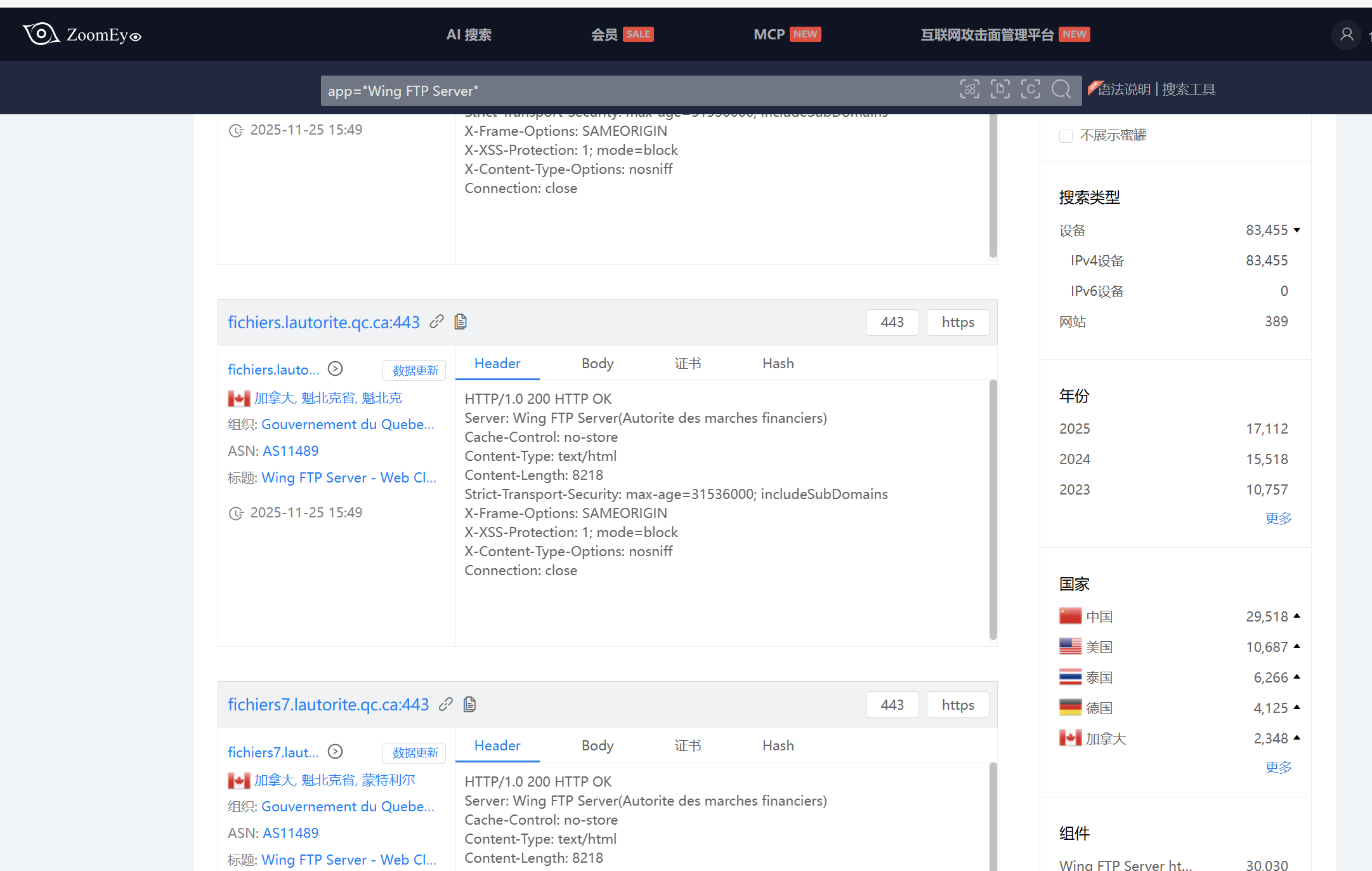 搜索范围涵盖全球 IP 地址、域名对应的各类网络资产。比如服务器、摄像头、打印机等硬件设备;开放端口、运行的中间件、操作系统版本等服务信息;还有设备或服务中存在的高危漏洞、配置缺陷等风险相关内容,能精准定位特定组件或漏洞对应的全网资产。