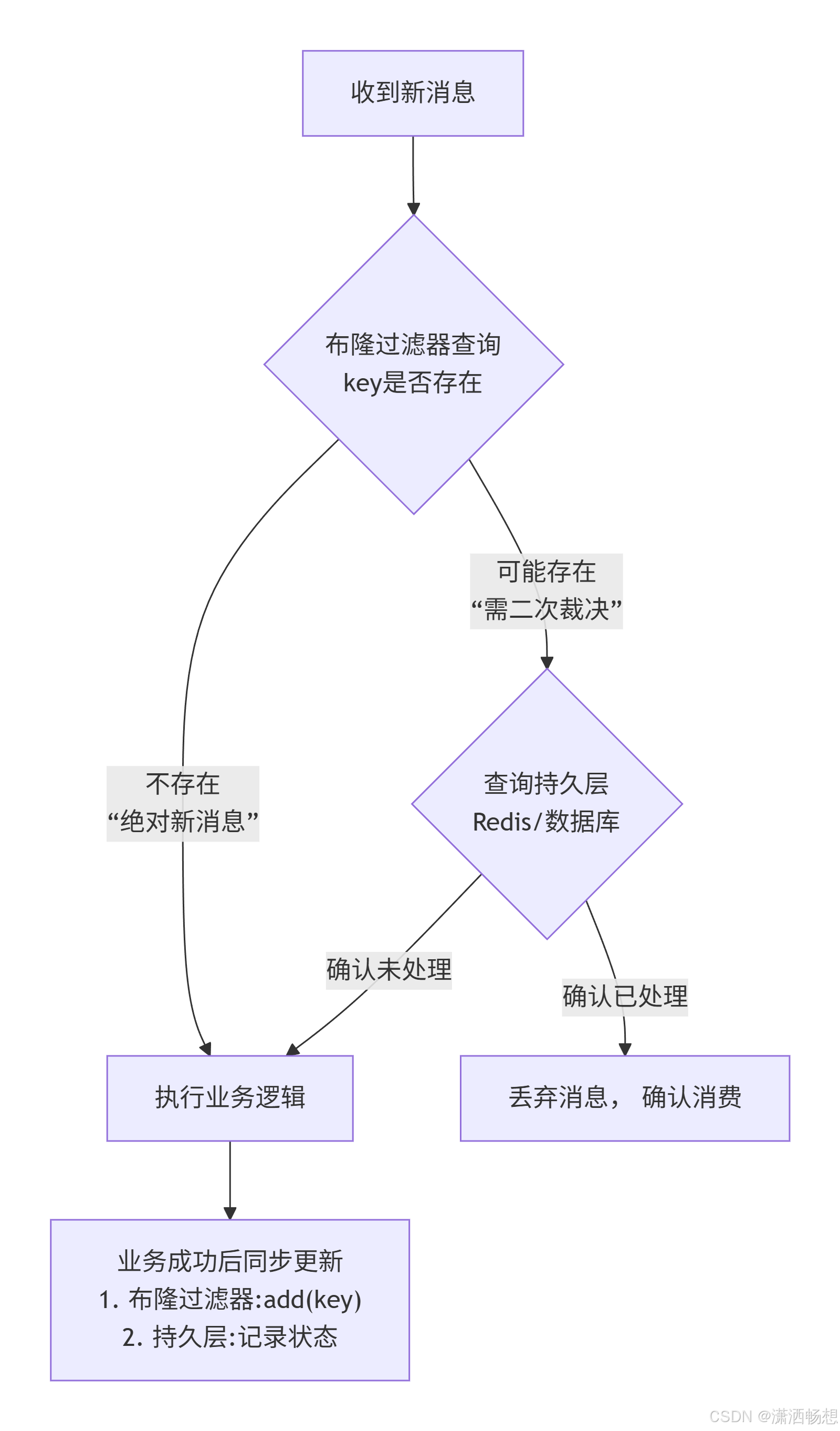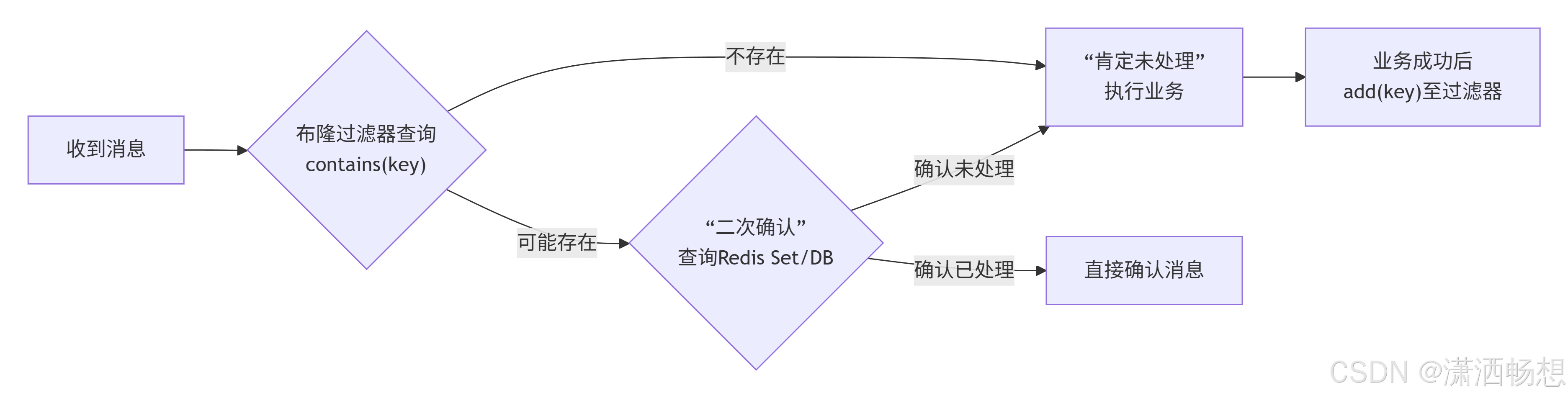 若返回 "存在" ,则可能处理过 。由于有误判,通常需进一步查询更可靠的数据源(如数据库或方案一中的Redis Set)进行二次确认。如果二次确认未处理,再执行业务。