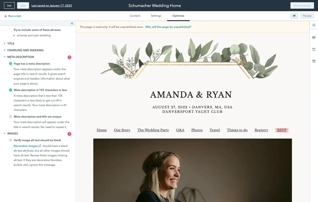 HubSpot 的 SEO 工具与 Content Hub 内容管理系统深度集成。在博客或页面编辑器中,点击侧边栏的「Optimize(优化)」图标,即可查看针对当前内容的 SEO 建议。