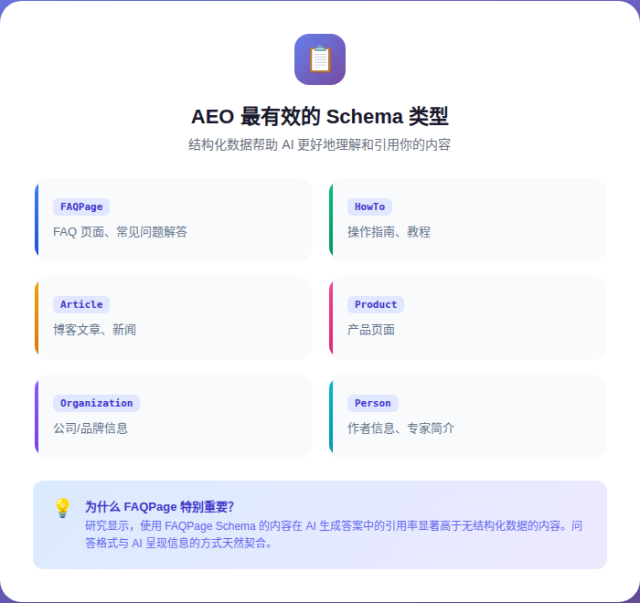 结构化数据帮助 AI 理解你的内容是什么、关于谁、解答什么问题。以下是对 AEO 最有效的 Schema 类型: