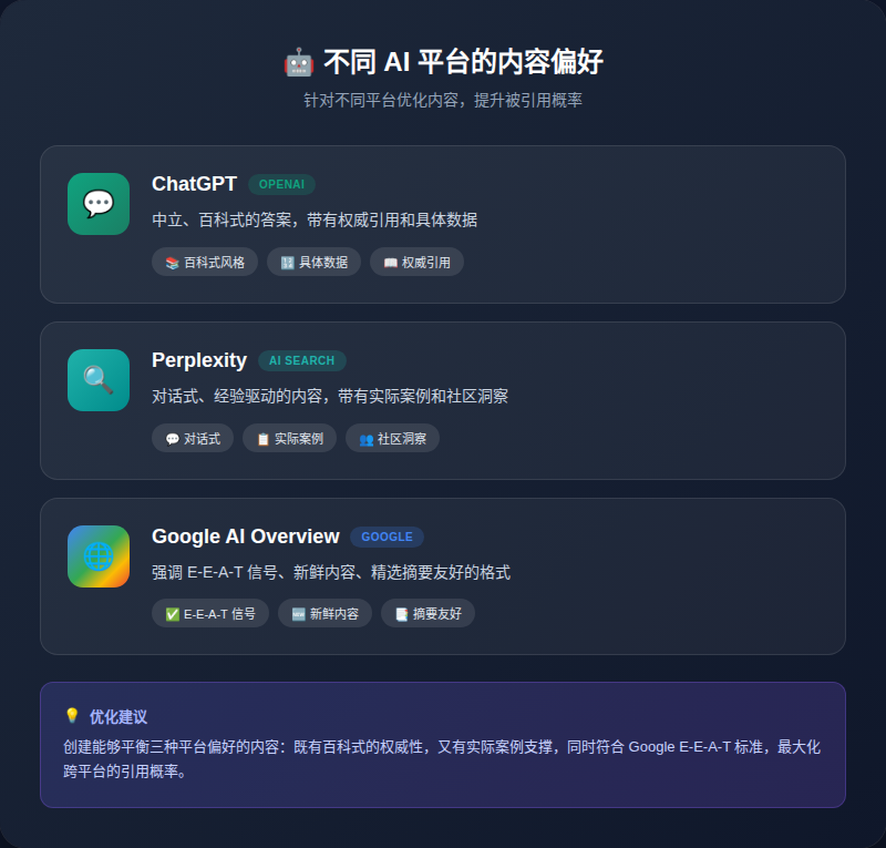 当你的网站围绕某个主题建立了完整的内容体系,搜索引擎会将你视为该领域的权威。而 AI 答案引擎在生成回答时,更倾向于引用这些被搜索引擎认可的权威来源。