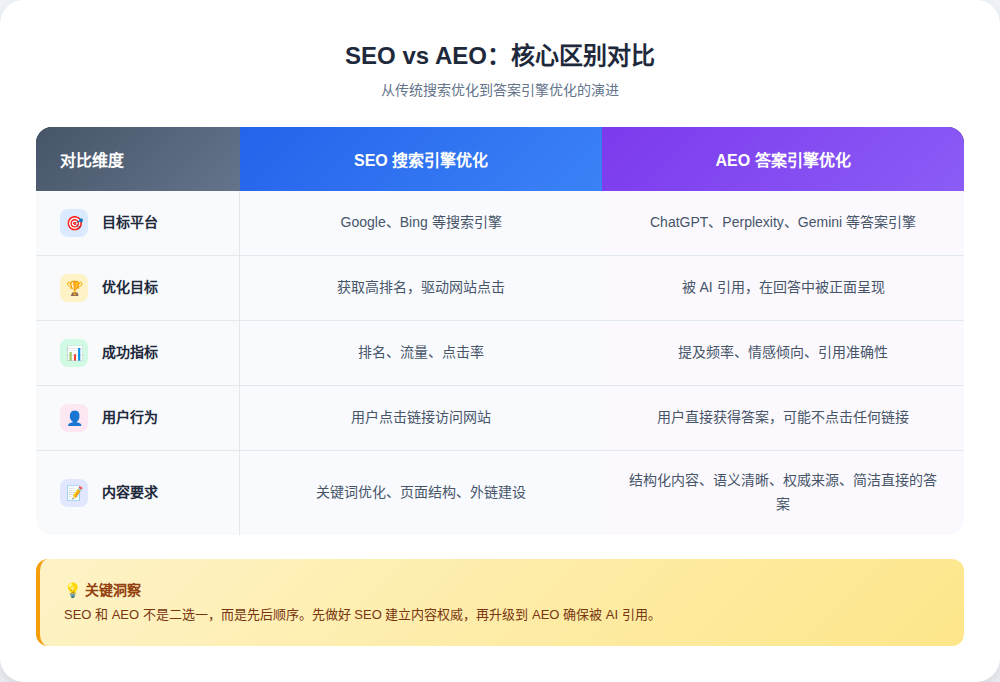 换句话说:SEO 建立的是内容库,AEO 只是扩大了内容的展现渠道,使其被 AI 引用。两者不是替代关系,而是递进关系------先做好 SEO,才有资格在 AI 时代被引用。