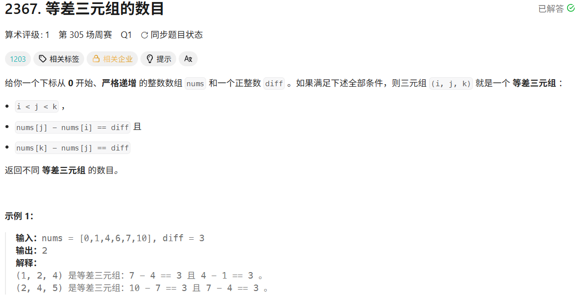 对于i来言,从左到右遍历,数是递增的。也就是找到下一个数num[j] - nums[i] == diff以及nums[k] - nums[i] == 2 * diff。简化成双指针,随着i的增加,每次调整j、k使之满足条件即可