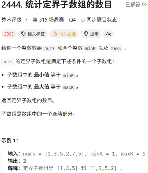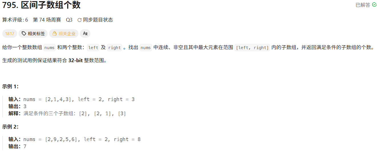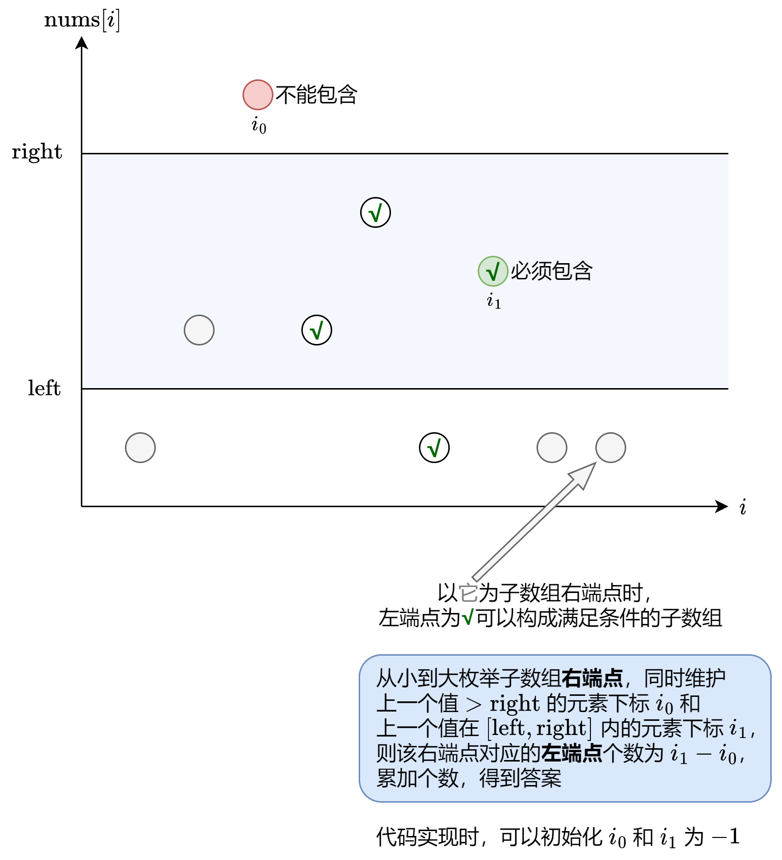 枚举子数组的右边界,需要确定左边界的范围。左边界应该是nums[l]刚好大于right,nums[r]大于等于left.