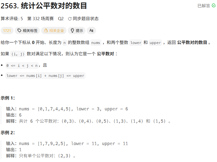 数对而言,没有相应顺序要求,因此不妨给数组进行排序。对于lower <= nums[i] + nums[j] <= upper。可以拆解为