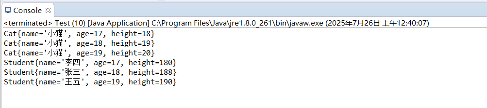 Cat.java 和 Student.java 类实现了 Comparable<Cat> 接口,这意味着 Cat 和 Student 对象可以进行比较和排序,重写 Comparable 接口中的抽象方法 compareTo 方法:通过 return age - o.age 定义比较规则,按照 age 升序排序,当前对象年龄 - 目标对象年龄,结果 > 0 则当前对象值更大,实现了按年龄排序的规则。