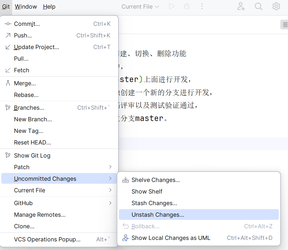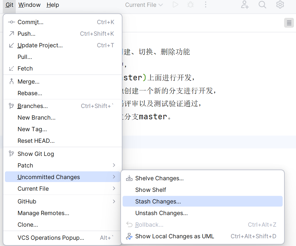 1、暂存本地代码(只有暂存了之后才可以切换分支)