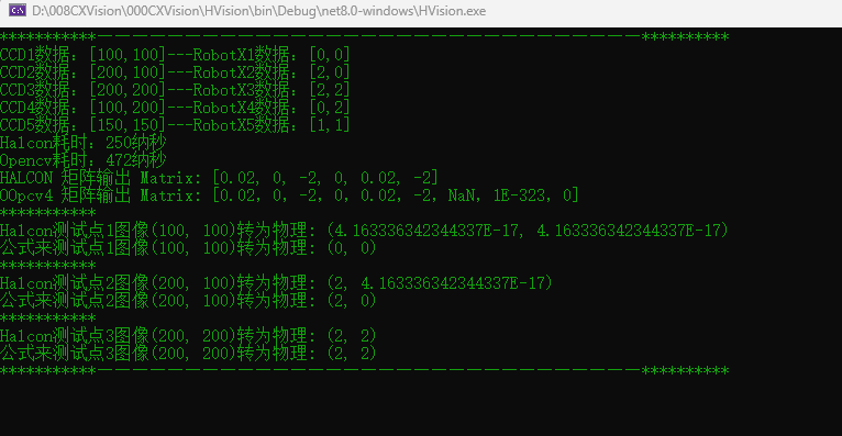 Console.WriteLine($"Halcon测试点3图像({CCDX[2]}, {CCDY[2]})转为物理: ({rr}, {cc})");