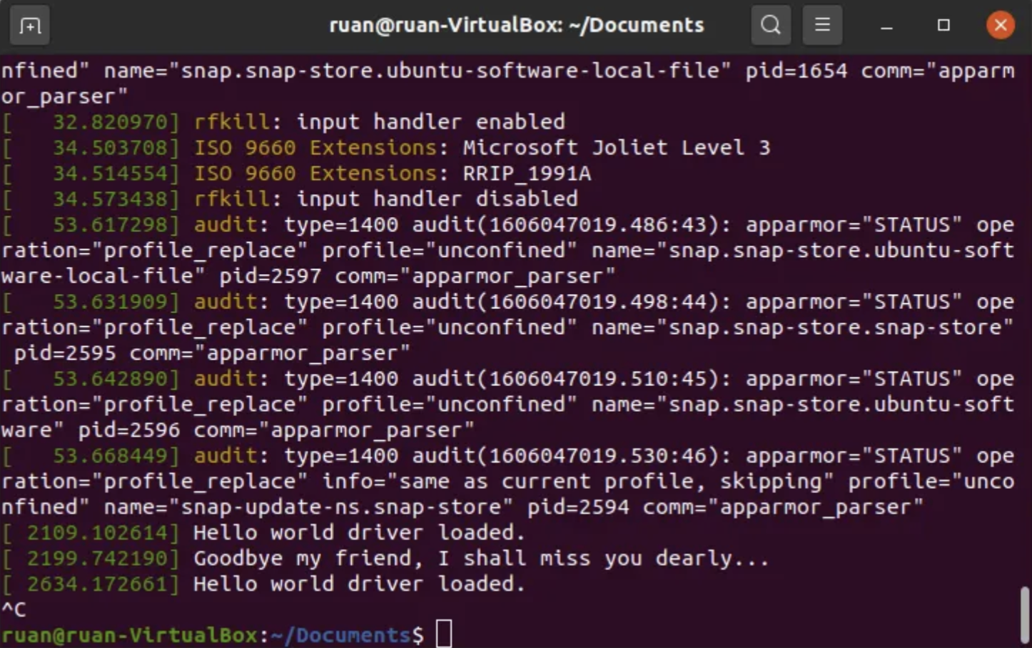 为了确保驱动程序正确加载,我们还在源代码中添加了日志记录功能,请在终端中运行 `dmesg` 命令。该命令会将内核日志打印到屏幕上,方便阅读。`dmesg` 输出的最后几行应该 包含 来自驱动程序的消息,例如确认"hello world"模块已加载等。请注意,驱动程序的初始化和退出消息可能会有延迟,但如果您加载和卸载模块两次,所有这些消息都应该会被记录。如果您想实时监控日志,可以打开第二个终端并运行**`dmesg --follow`**命令。然后,当您在第一个终端中加载和卸载驱动程序时,您将看到消息实时显示。