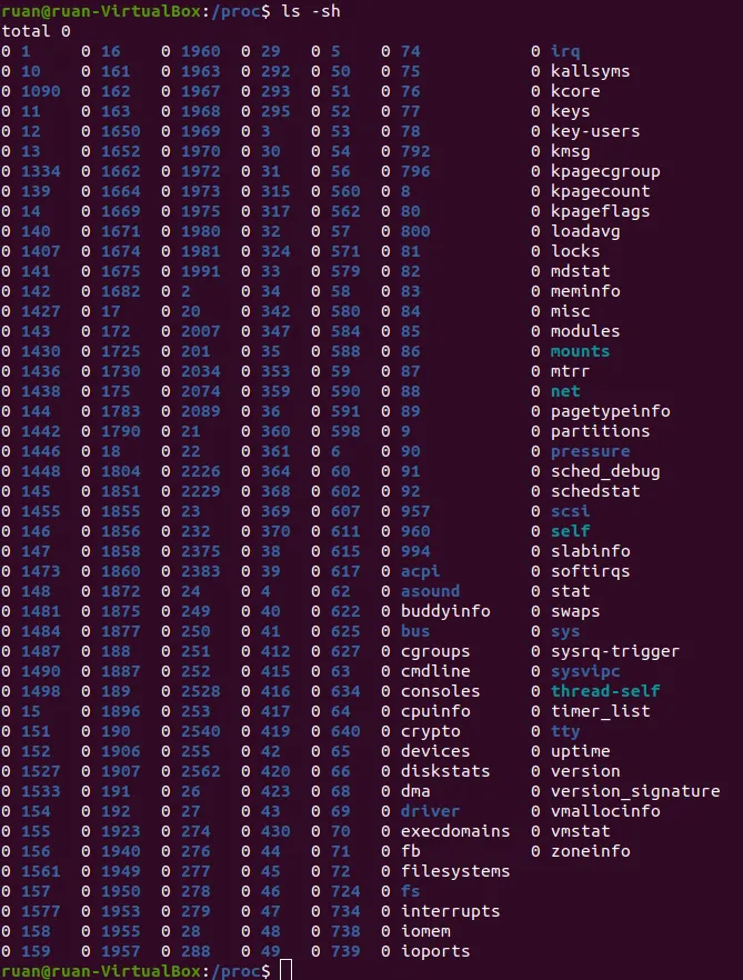 为了演示,打开另一个终端并运行**`cd /proc`** 。运行**`ls` 命令** 会列出文件。现在运行**`cat modules`** ,屏幕上会显示一些文本。这看起来眼熟吗?应该很眼熟;你之前运行的**`lsmod`** 命令显示的所有模块都在这里。现在试试**`cat meminfo`** 。这将显示虚拟机内存使用情况的信息。很棒!另一个要运行的命令是**`ls -sh`**。这将在每个文件名称旁边打印出文件大小,然后......等等,这是什么鬼?