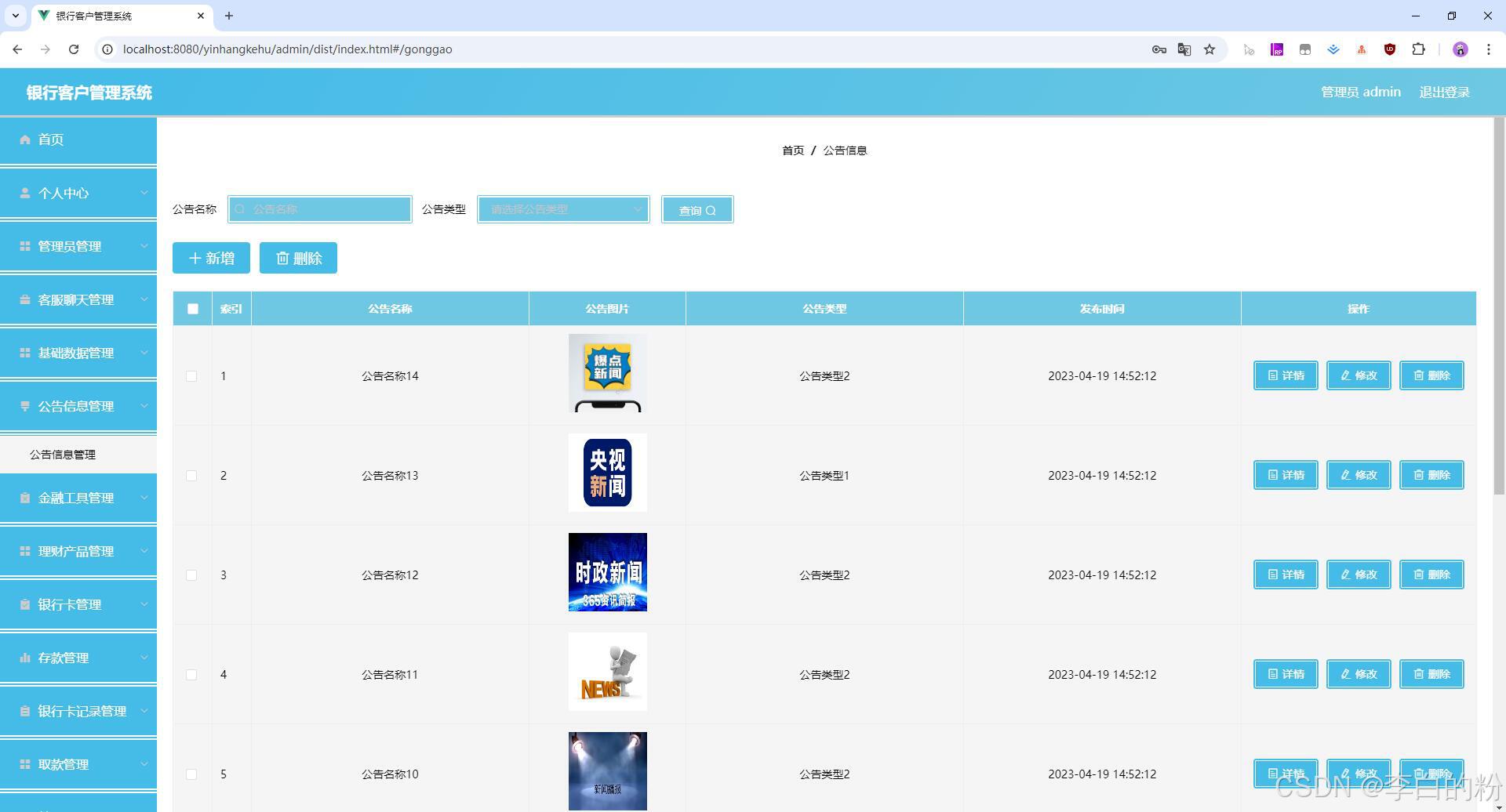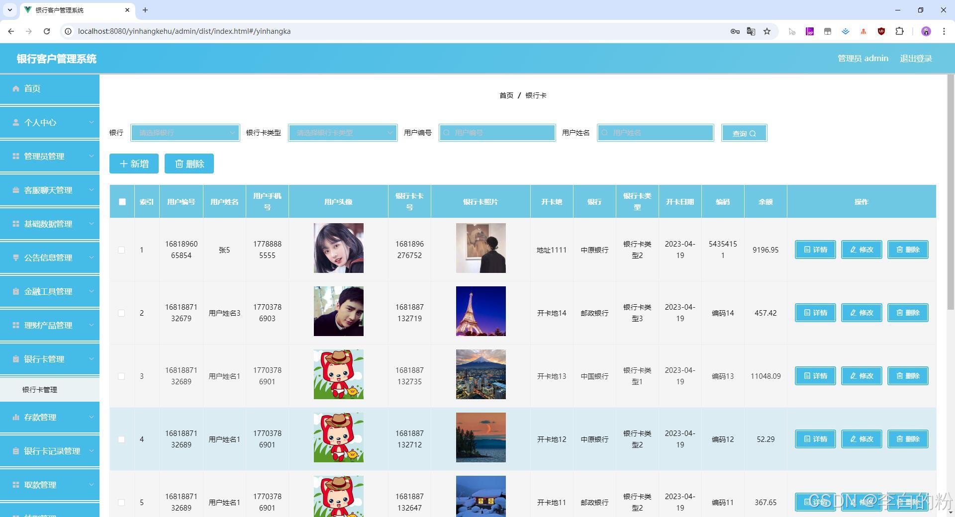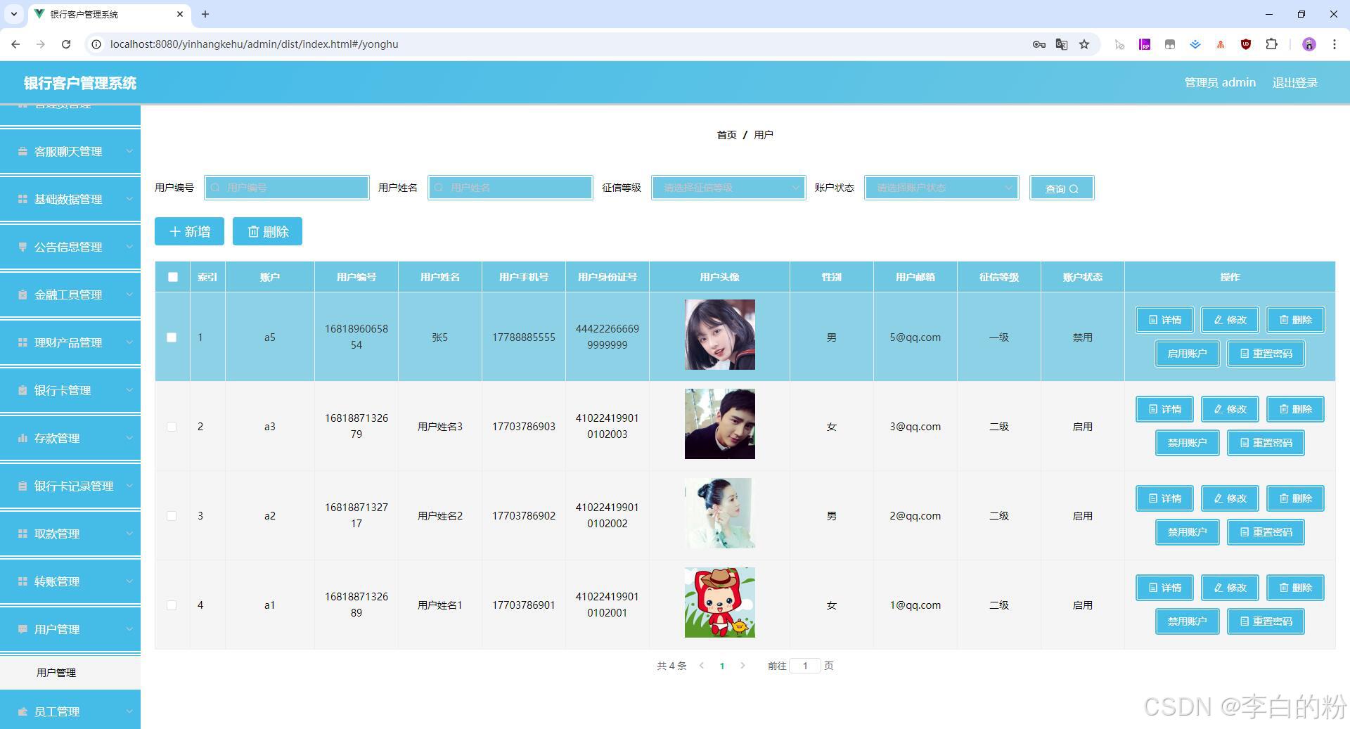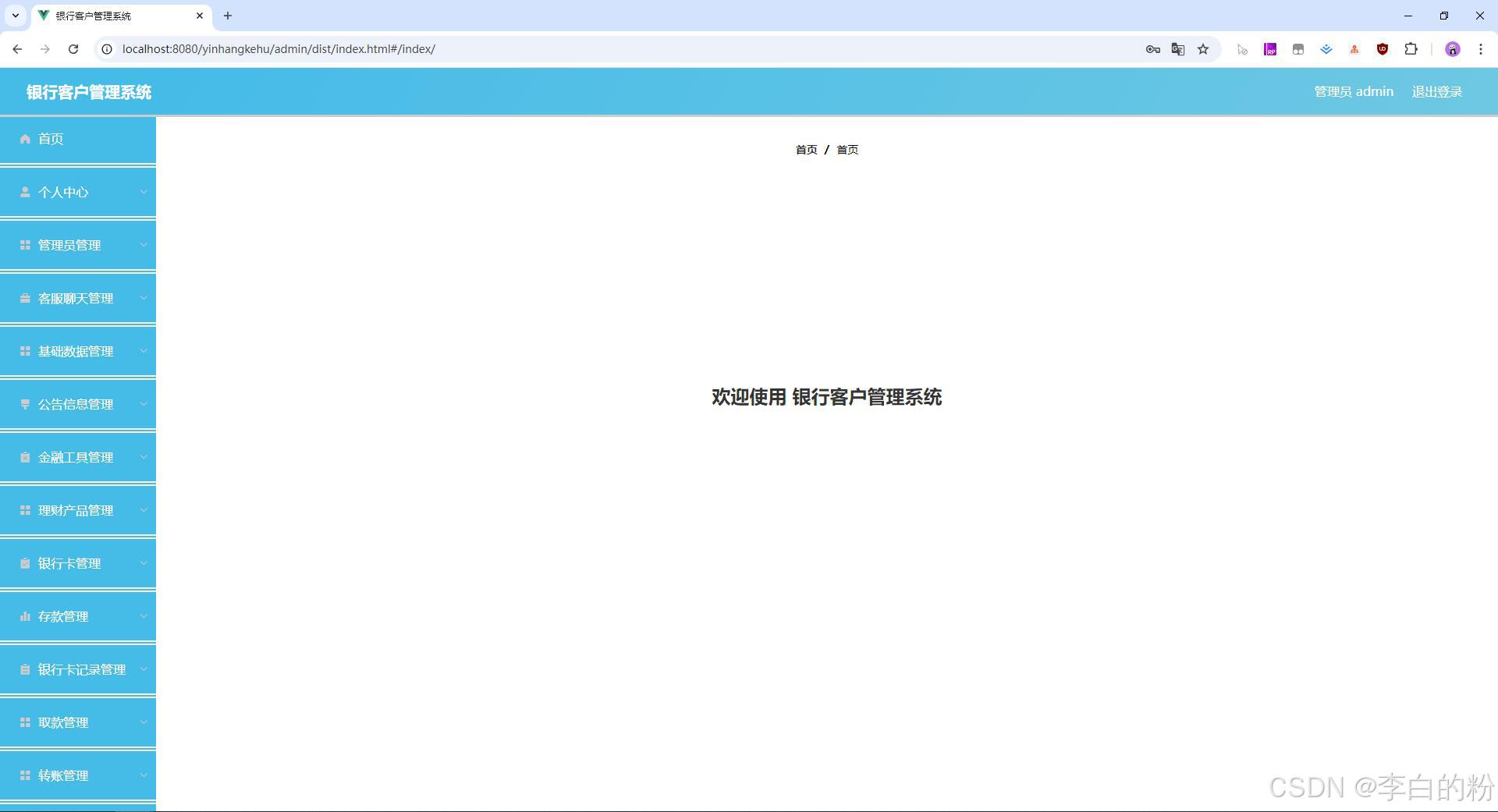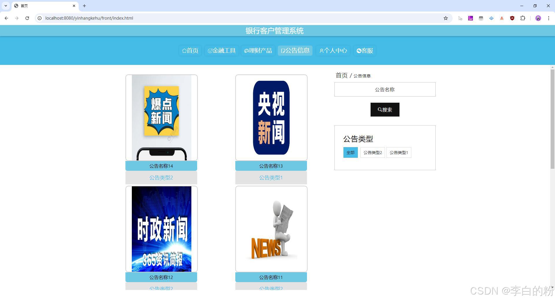 基于springboot的银行客户管理系统,前端采用html+vue,后端采用springboot+mybatis,系统采用MVC三层架构,角色:管理员、用户,系统功能齐全,代码简洁易懂,适合小白学编程...
