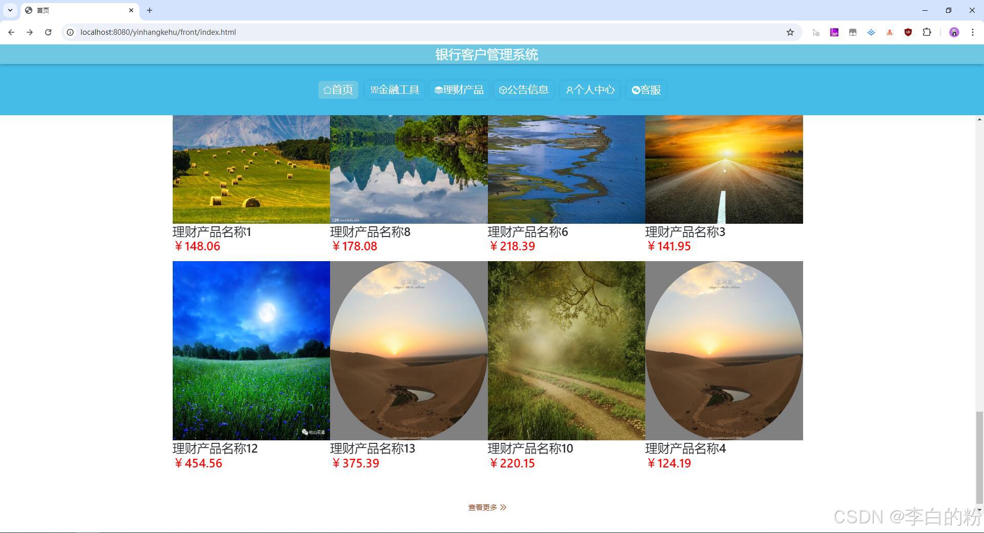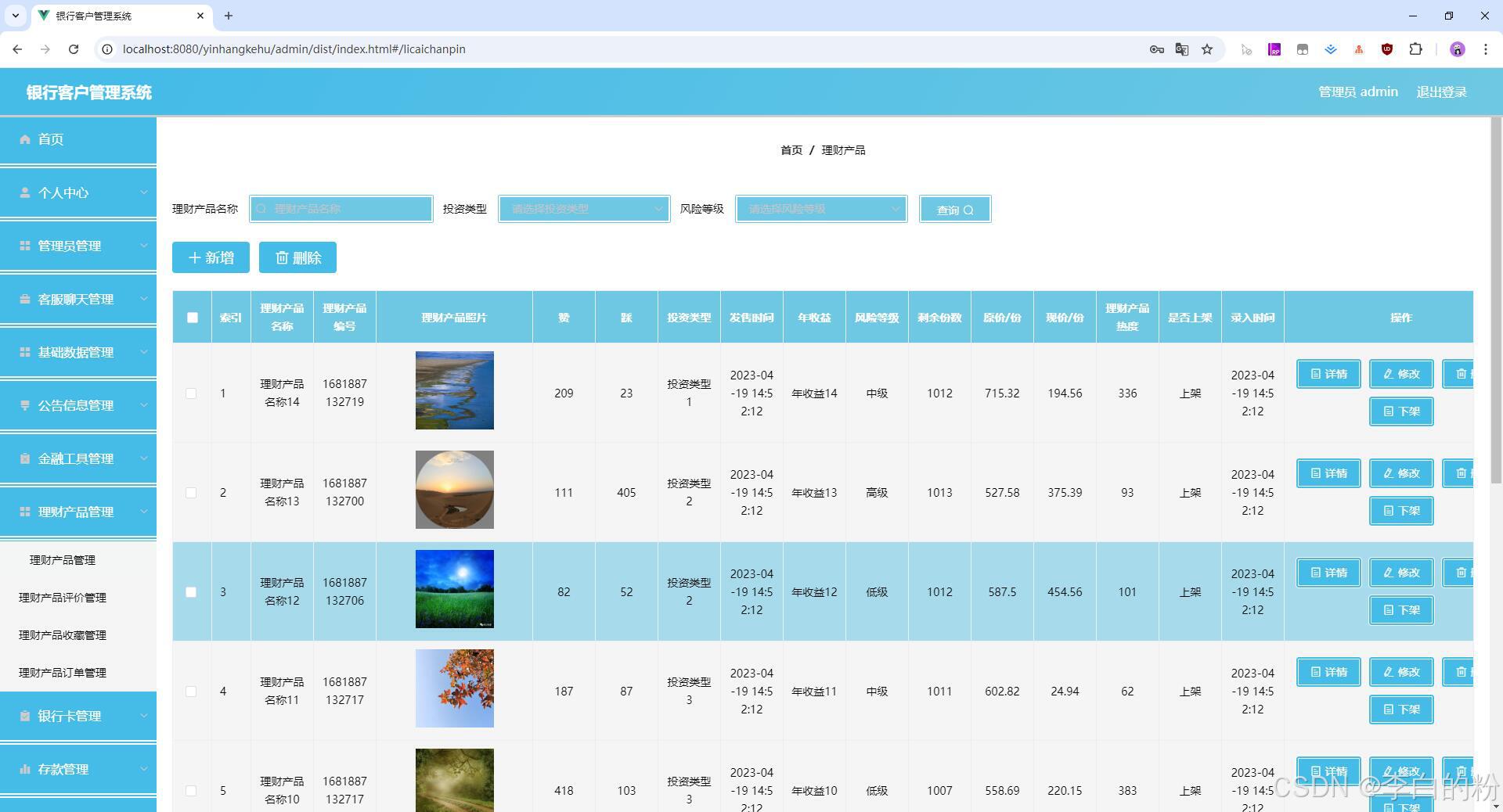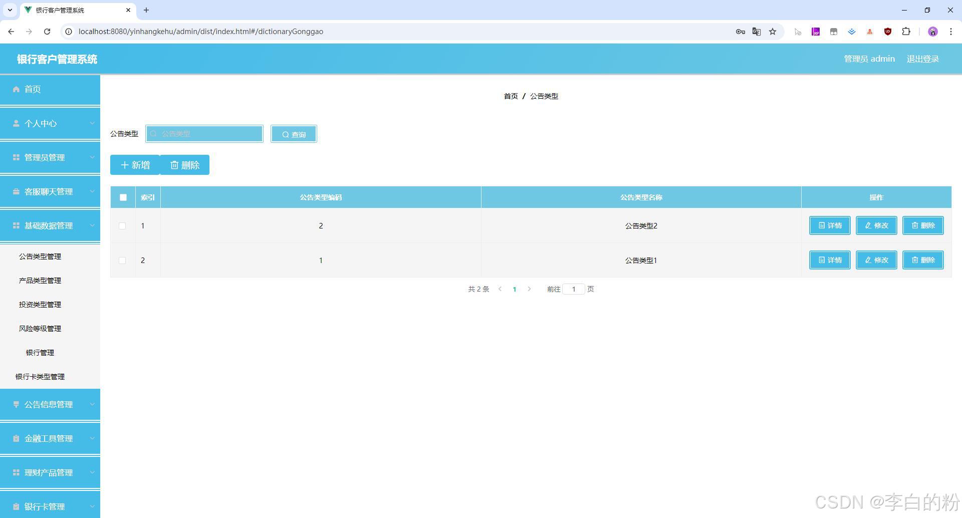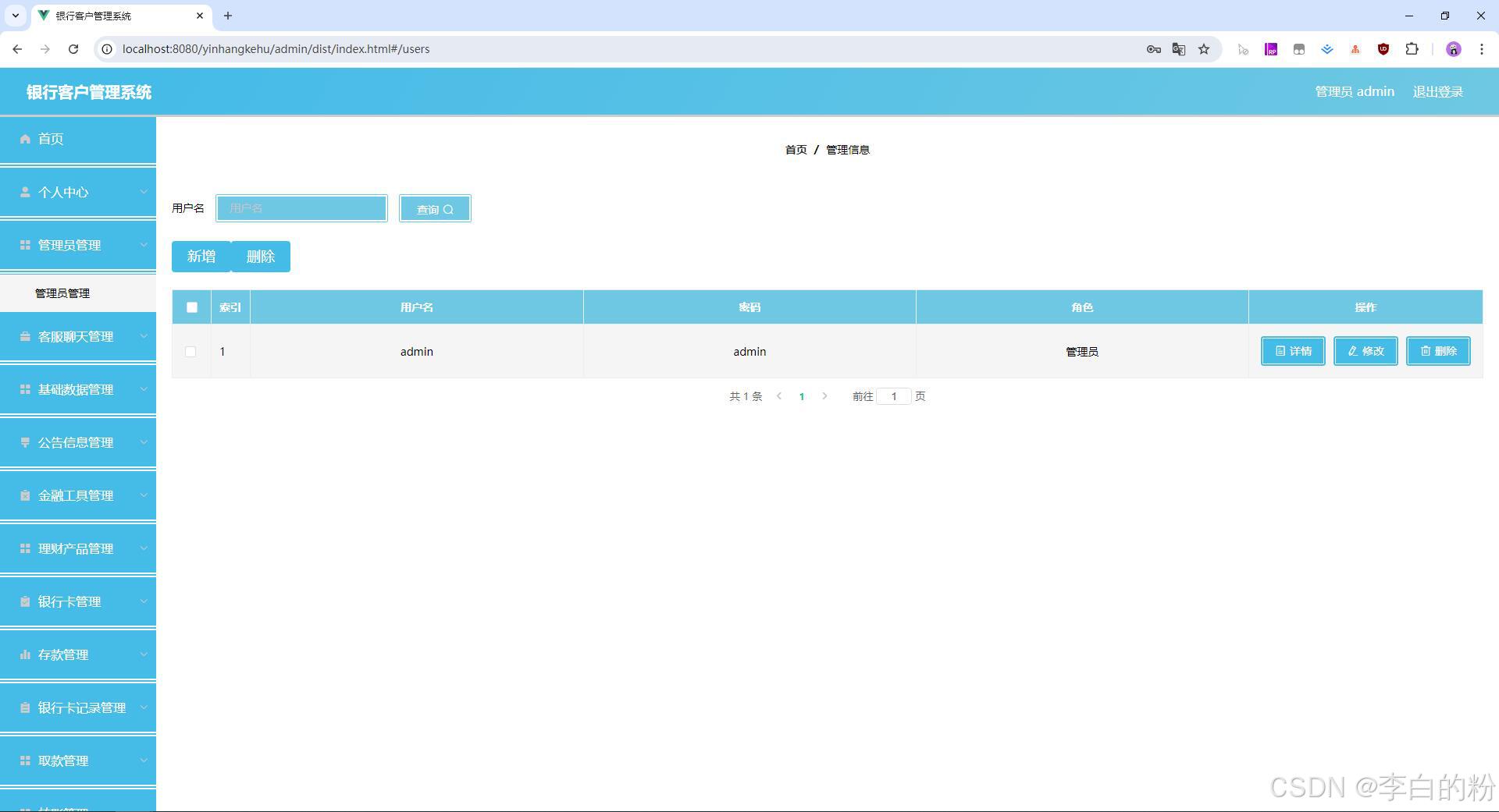 基于springboot的银行客户管理系统,前端采用html+vue,后端采用springboot+mybatis,系统采用MVC三层架构,角色:管理员、用户,系统功能齐全,代码简洁易懂,适合小白学编程...