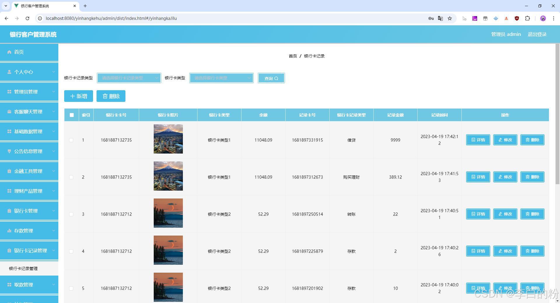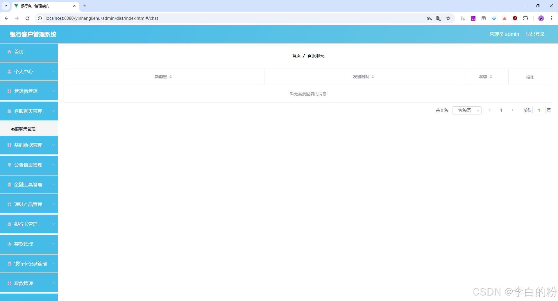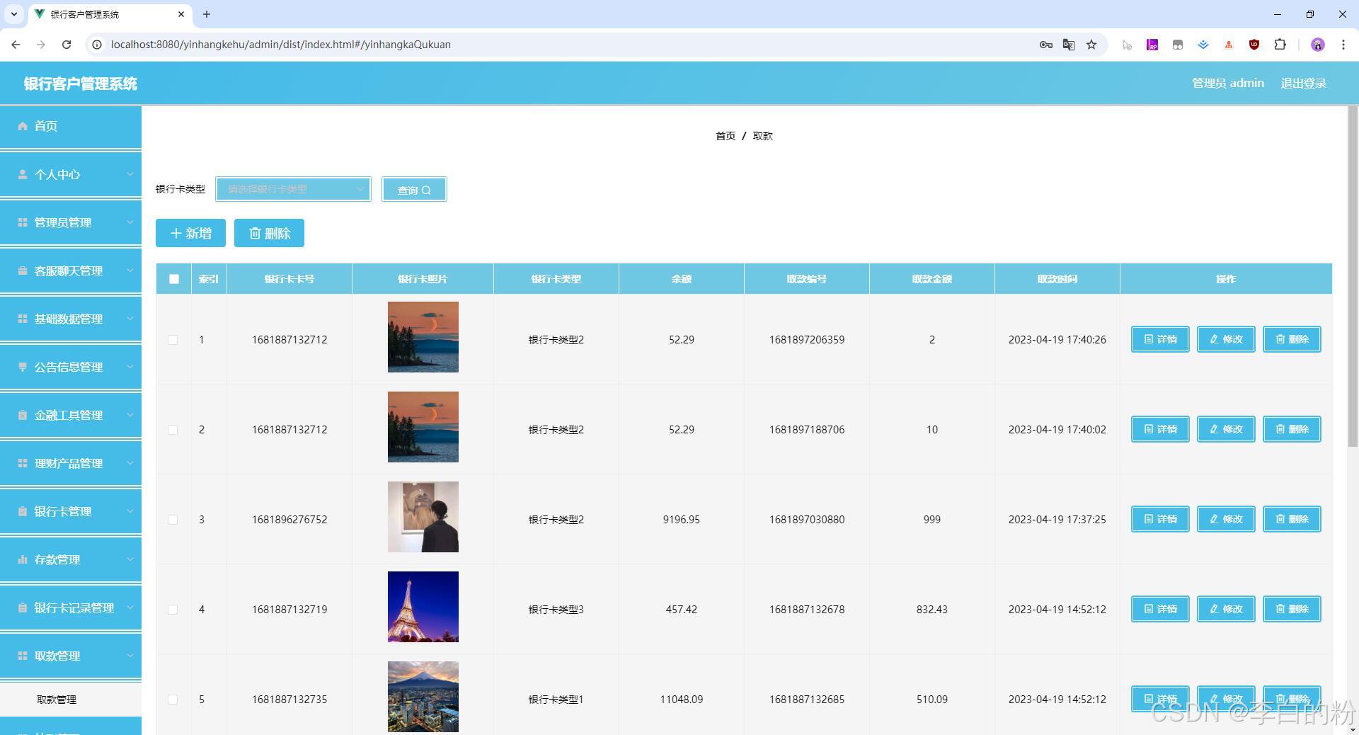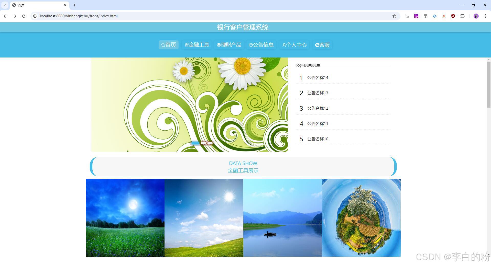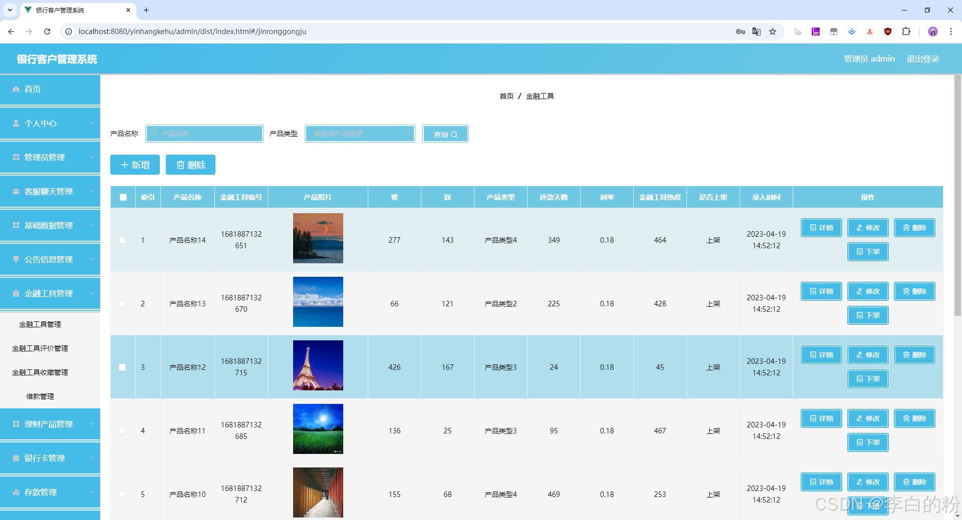 基于springboot的银行客户管理系统,前端采用html+vue,后端采用springboot+mybatis,系统采用MVC三层架构,角色:管理员、用户,系统功能齐全,代码简洁易懂,适合小白学编程...