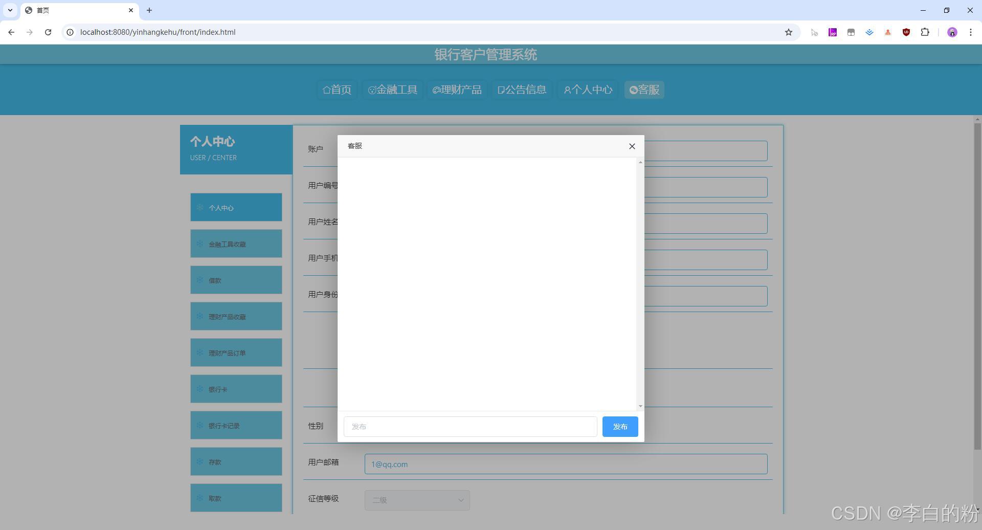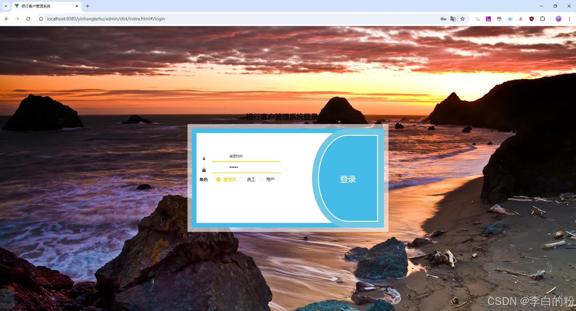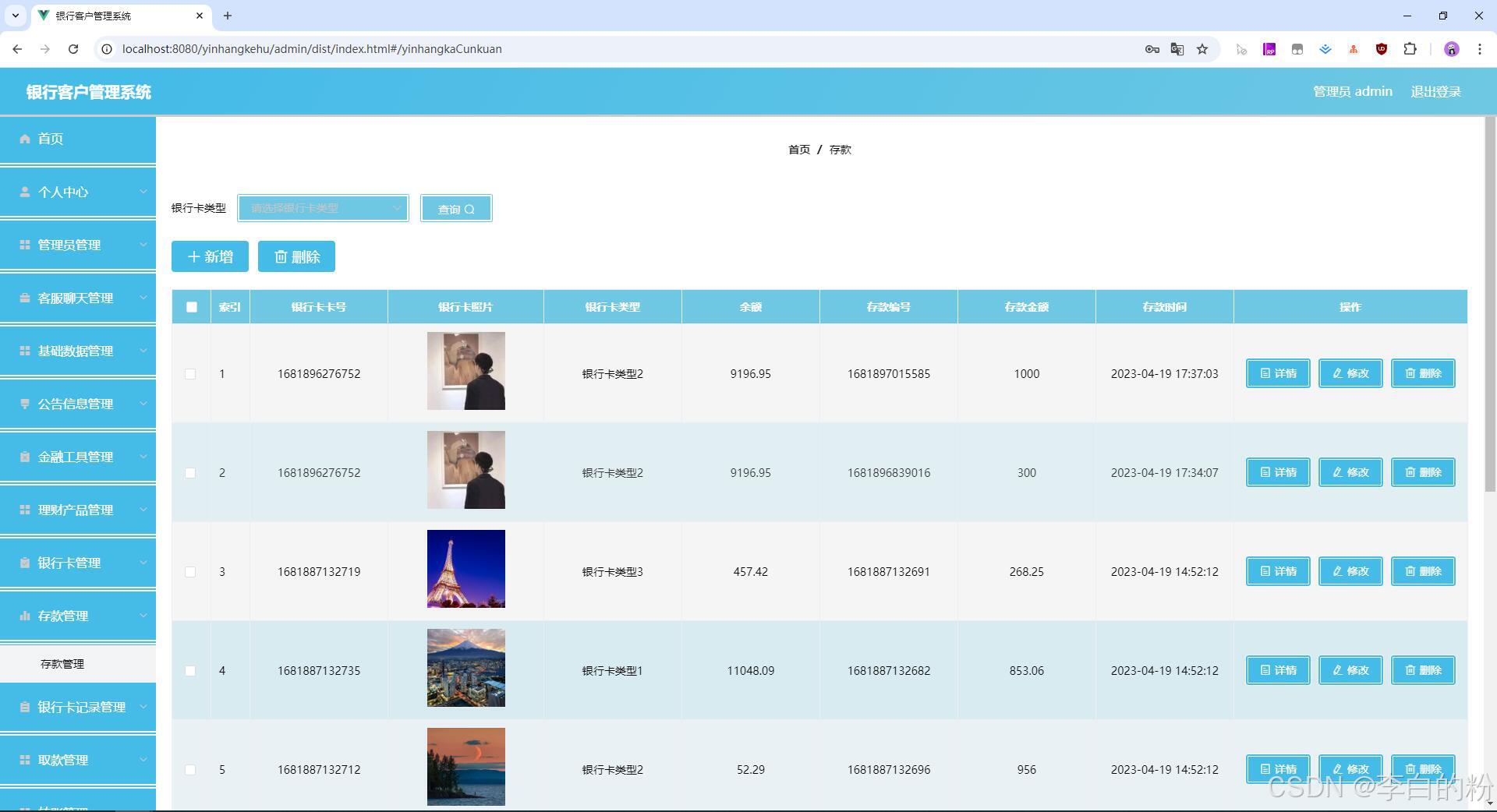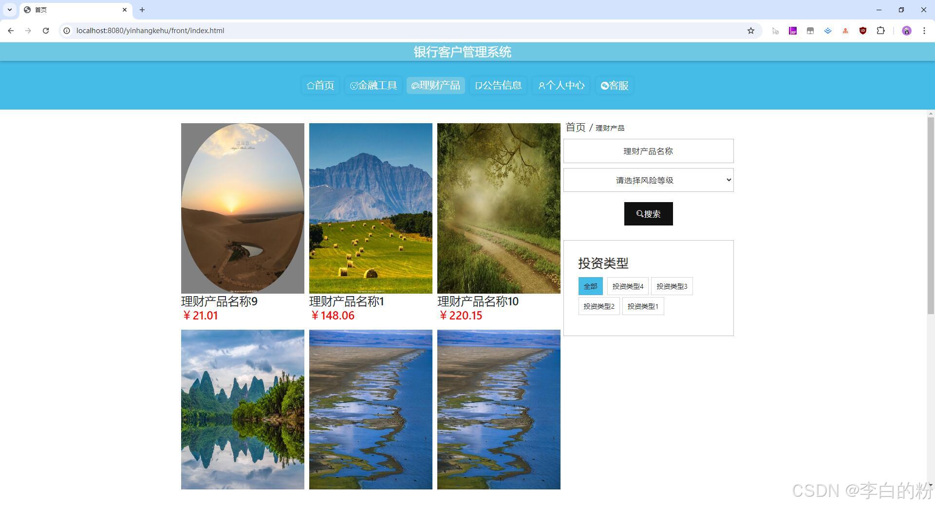 基于springboot的银行客户管理系统,前端采用html+vue,后端采用springboot+mybatis,系统采用MVC三层架构,角色:管理员、用户,系统功能齐全,代码简洁易懂,适合小白学编程...