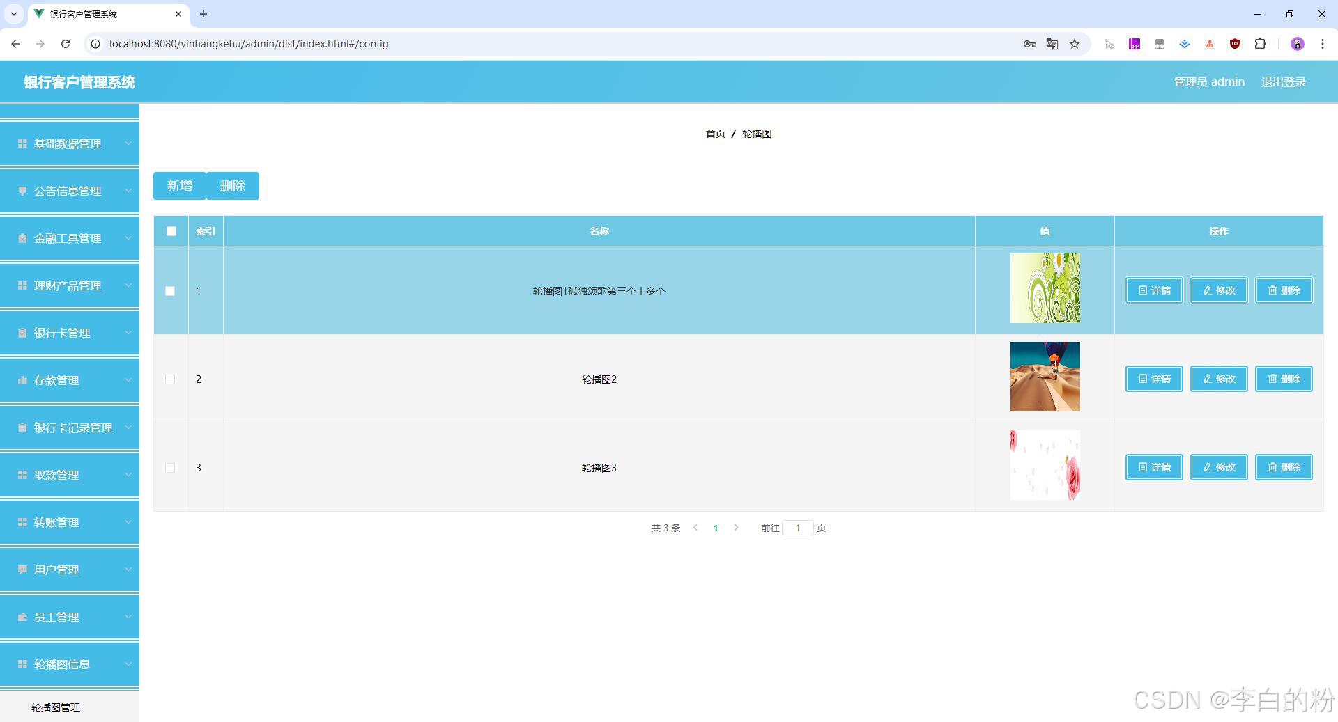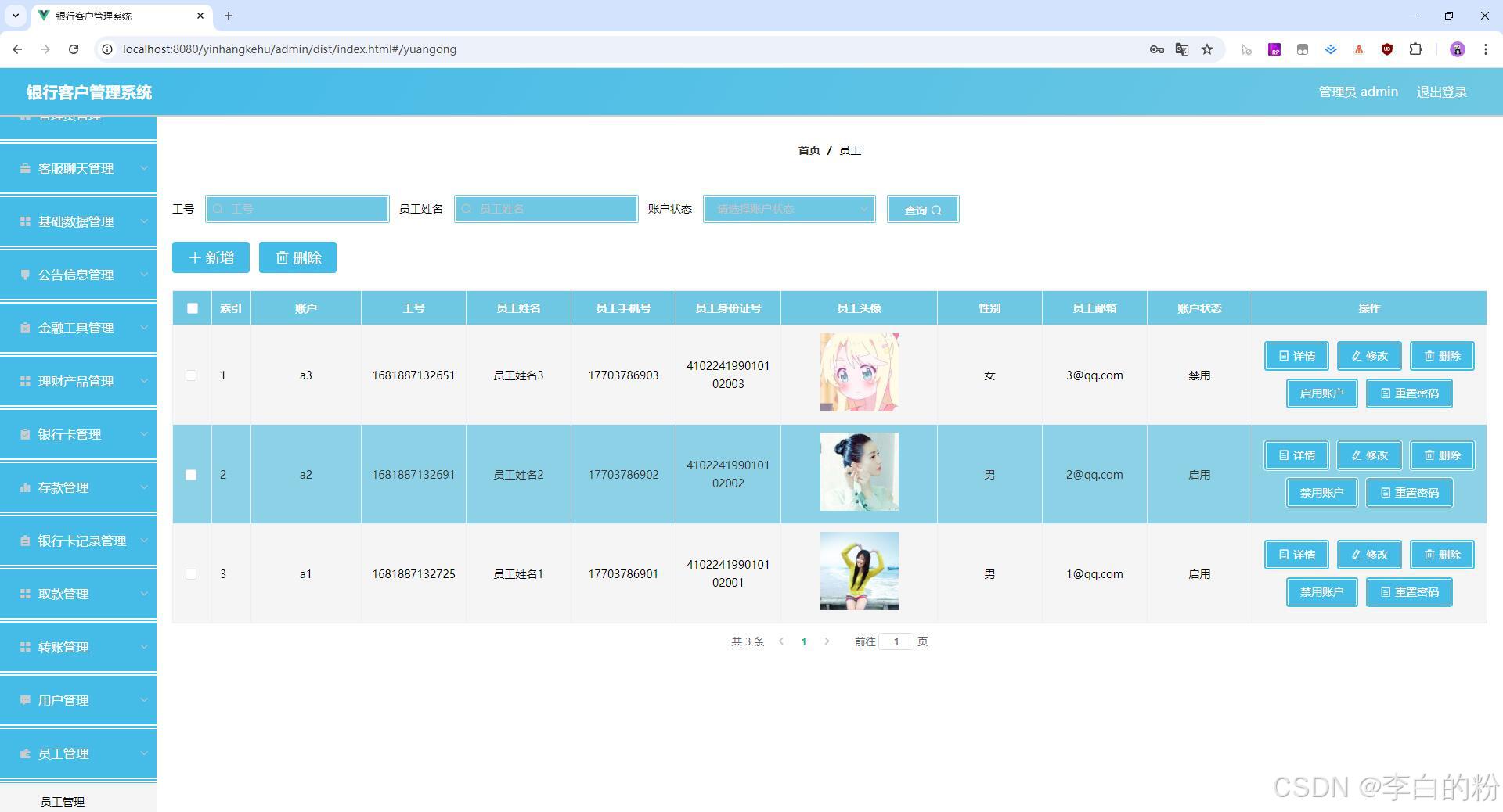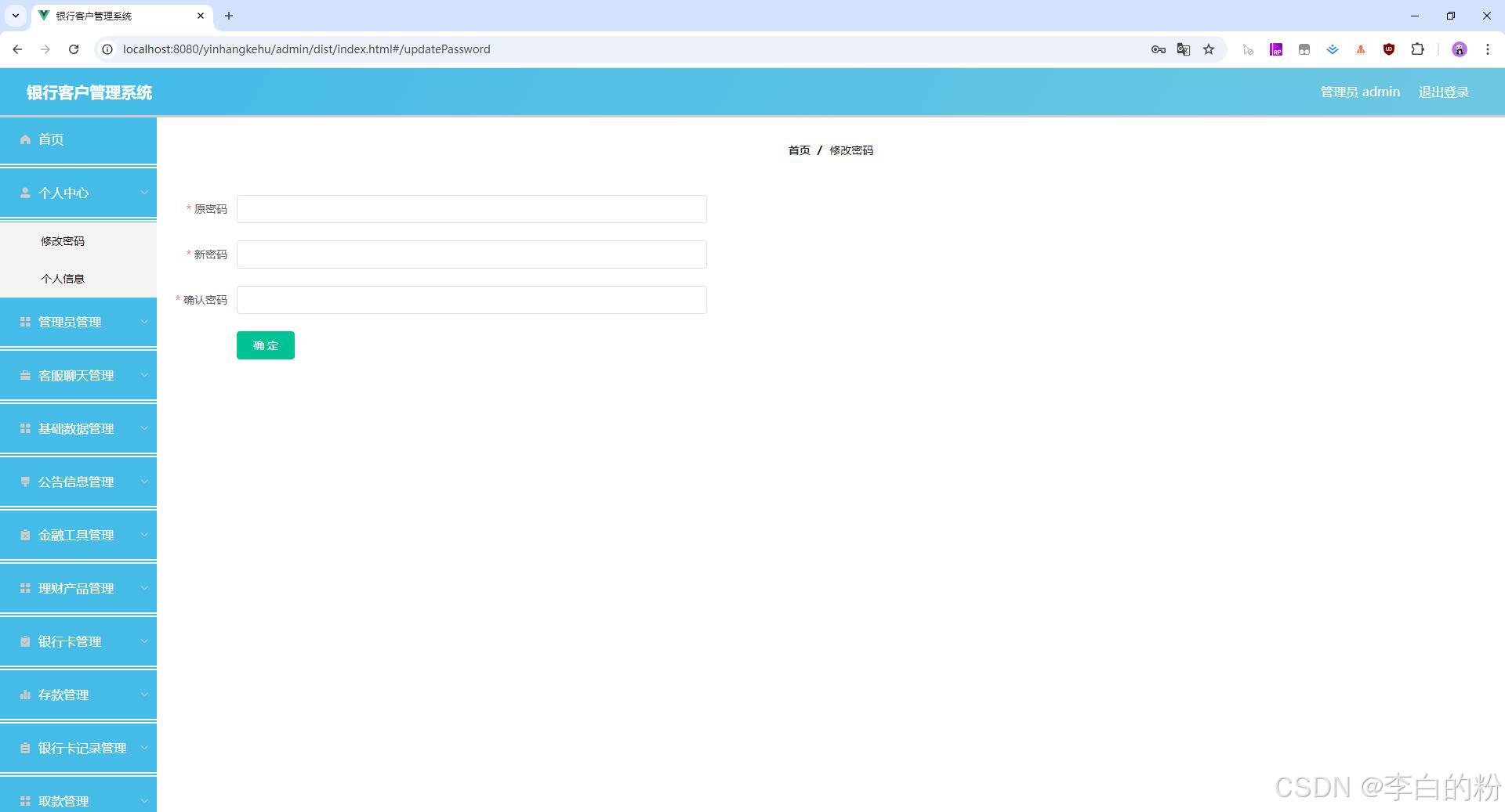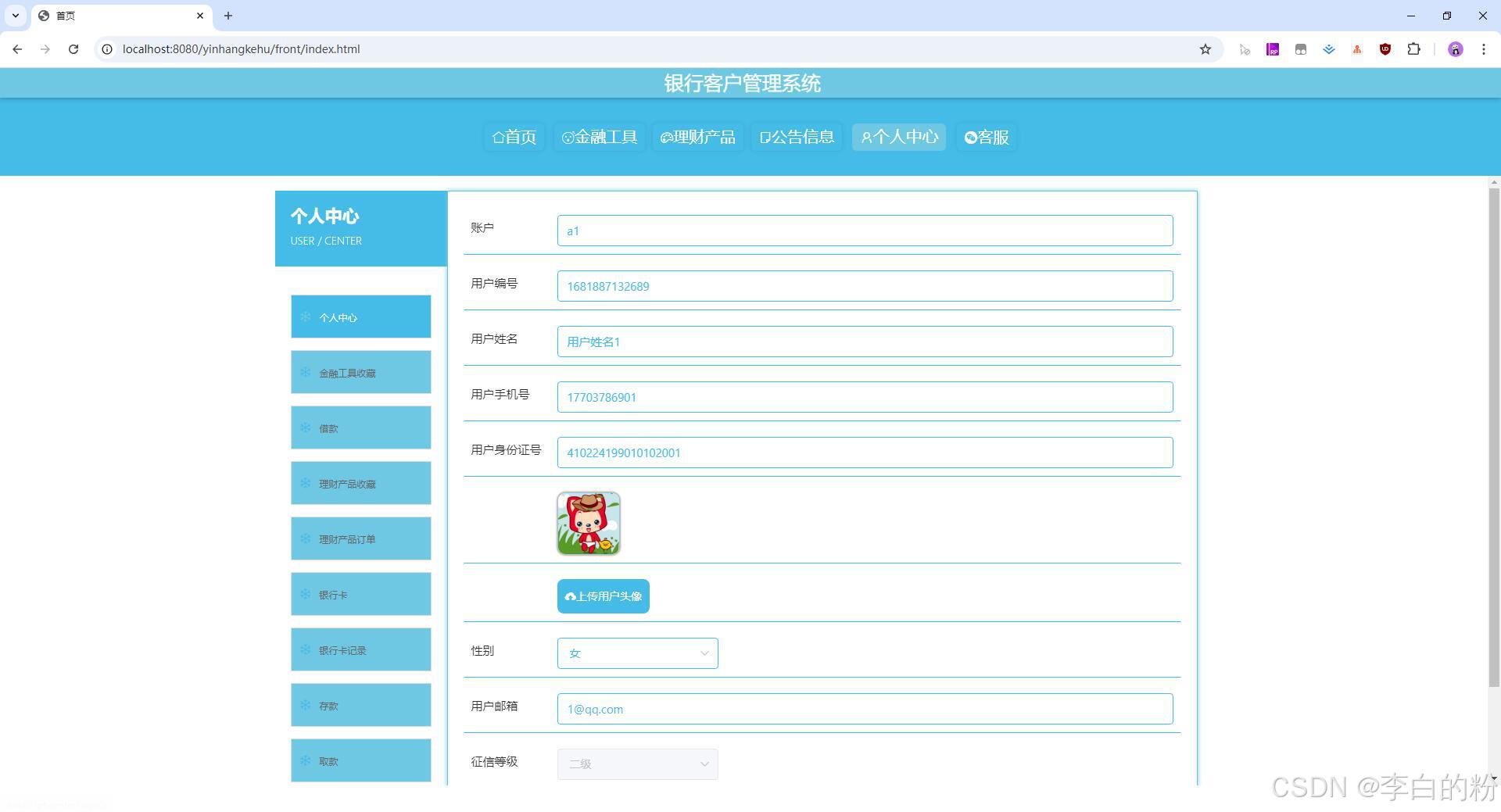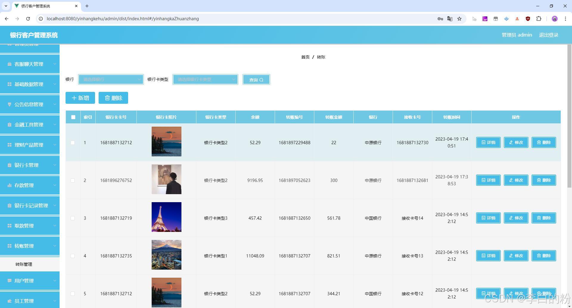 基于springboot的银行客户管理系统,前端采用html+vue,后端采用springboot+mybatis,系统采用MVC三层架构,角色:管理员、用户,系统功能齐全,代码简洁易懂,适合小白学编程...