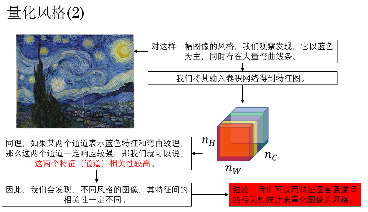因此,我们可以将一幅图像的风格,量化为其特征图中各通道之间的相关性统计 。