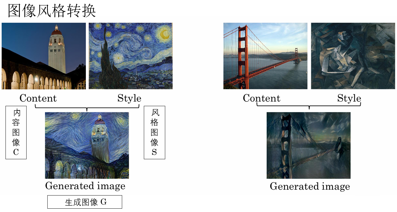 如图所示,使用图像风格转换,我们就可以把自己拍的照片在保证内容不变的同时,转换成名画,或者整蛊版的画风。这种应用更贴近我们的生活,在现在的手机应用里也十分普遍。