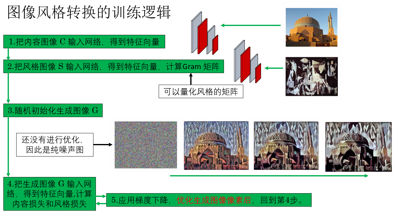这样一来,虽然网络不训练,我们仍然可以通过迭代优化生成图像,使其内容与风格逐步逼近目标。