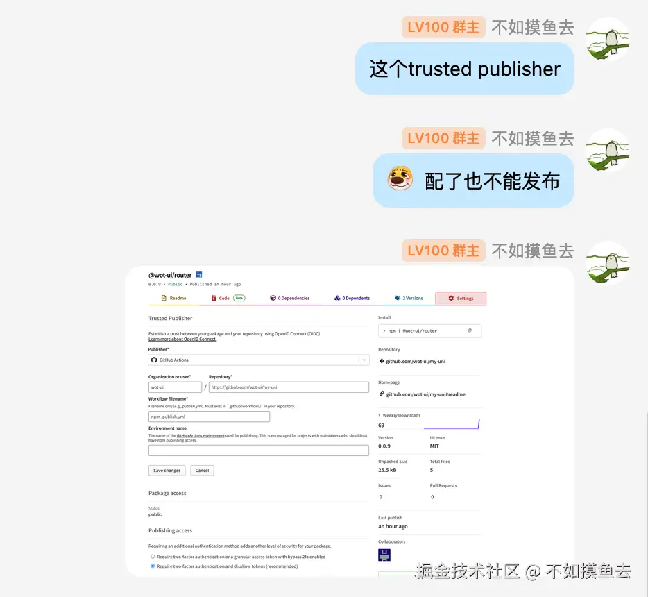 仓库,我配上了,workflow 文件,我填好了,俺老孙啥功名不要,只求把这包发上去。npm 的天王老子信不过我,我懂,让你小子整些 trusted publisher 唬我,我也懂。我不懂的是...你特不让我发包上去!
