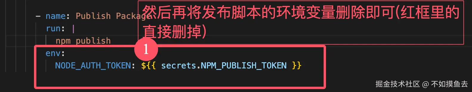 调整 GitHub Action 工作流文件,删除 npm 相关 token,也可以参考上方文档进行配置。