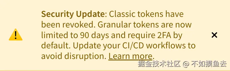 各位最近在 npm 上有没有见到这个这个提示?没错,经典 token 被废了!我也差点被废了,想发个新的包,死活发不出来啊,唉,都怪我不看文档啊😂。