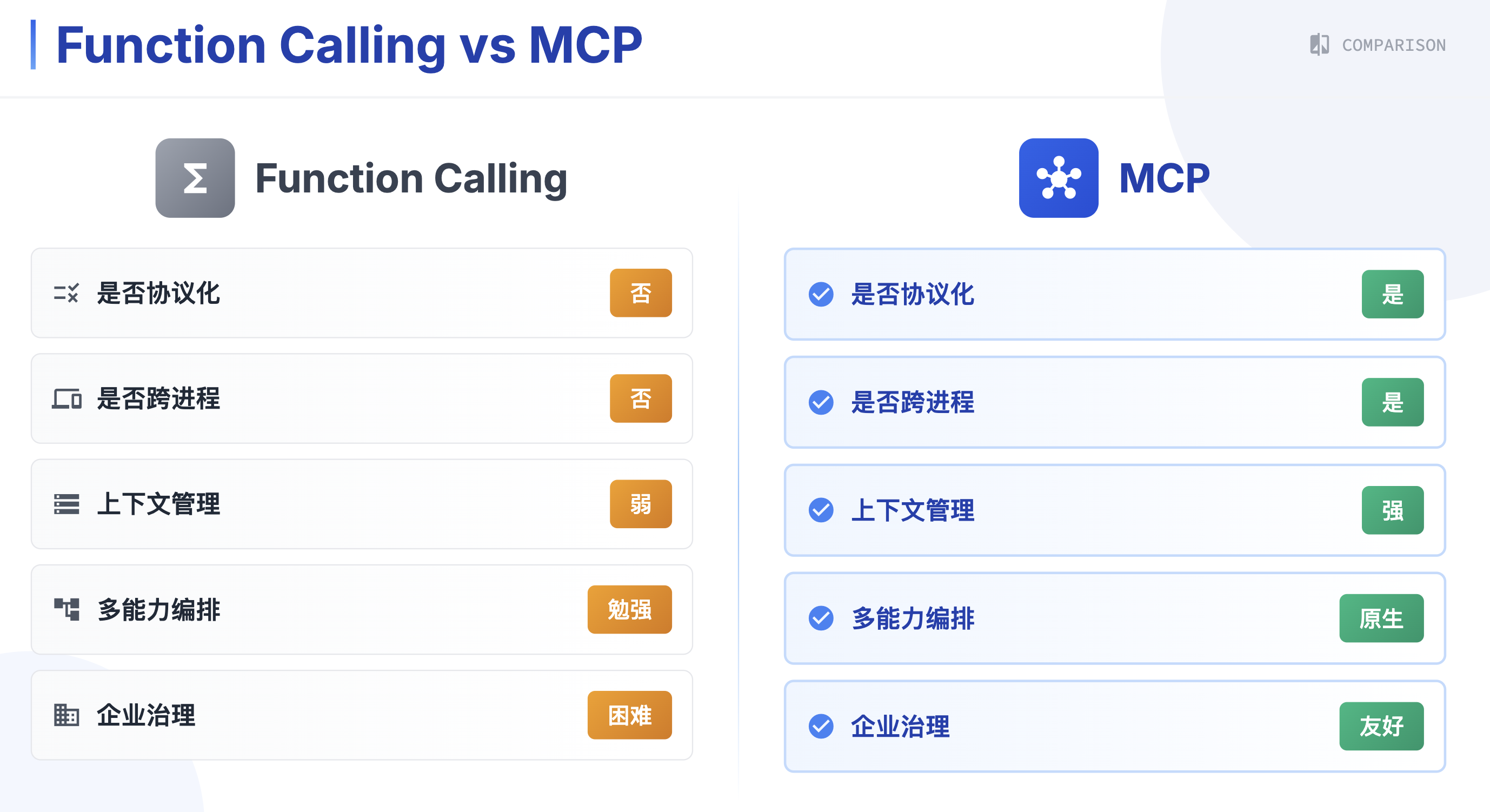 - Function Calling 是能力点,MCP 是能力体系。
