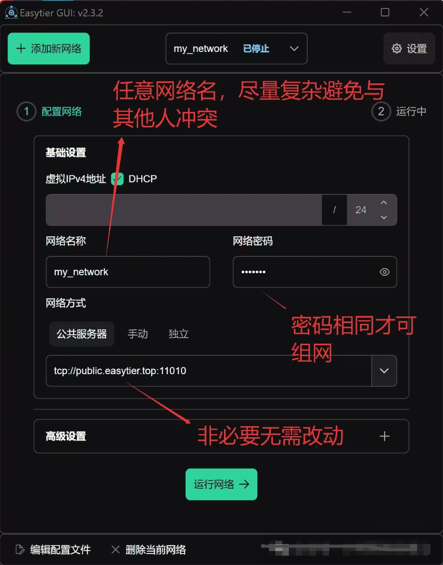 - 打开 EasyTier GUI,点击 "添加新网络";