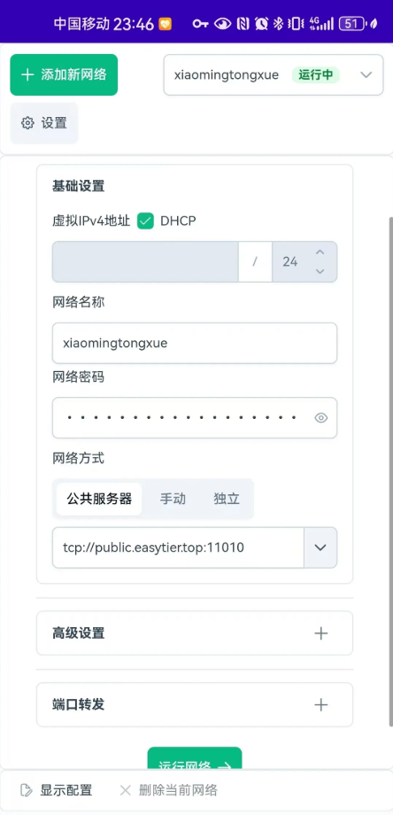 easytier-android-v2.4.3.apk),安装到手机; - 打开 APP,点击 "添加新网络",填写与 Windows 端一致的 "网络名称""网络密码",选择 "公共服务器";