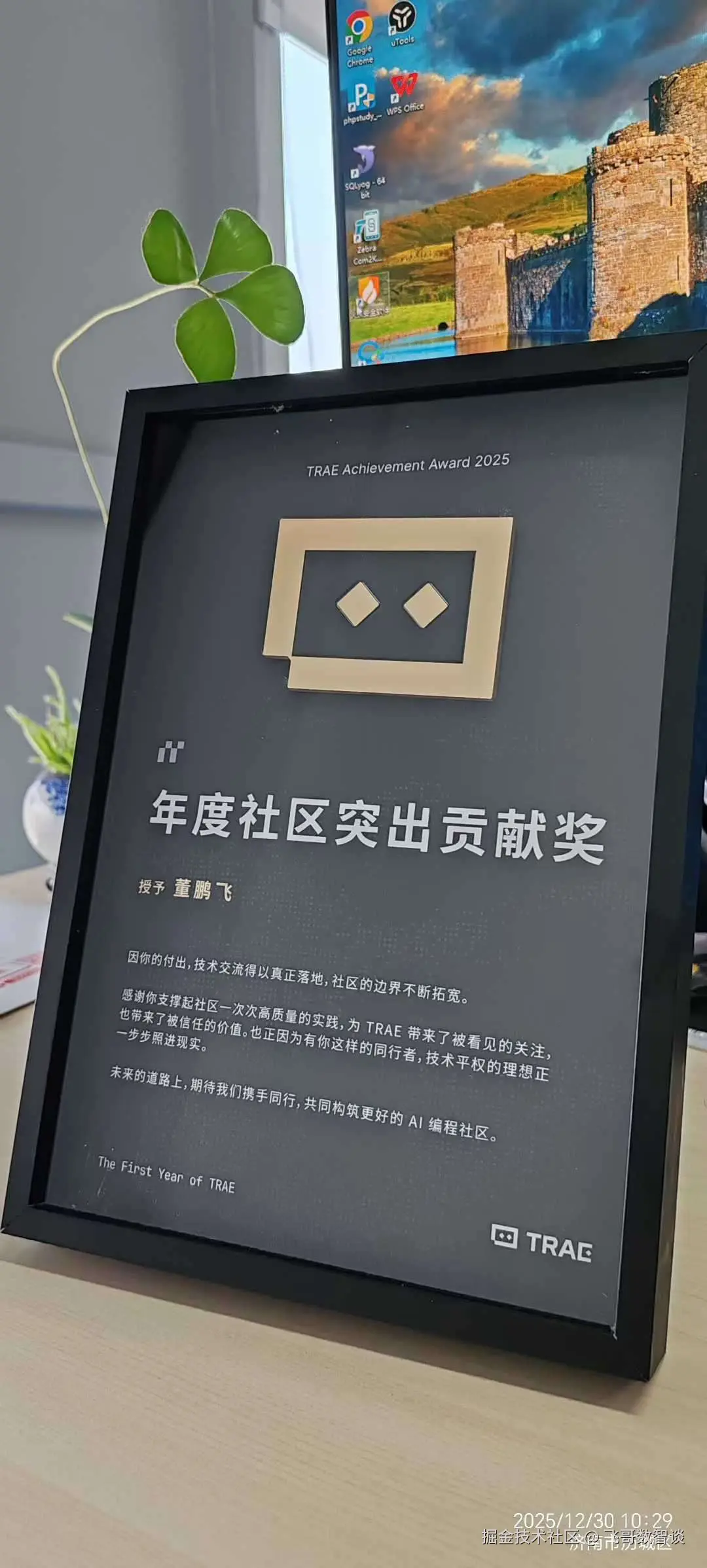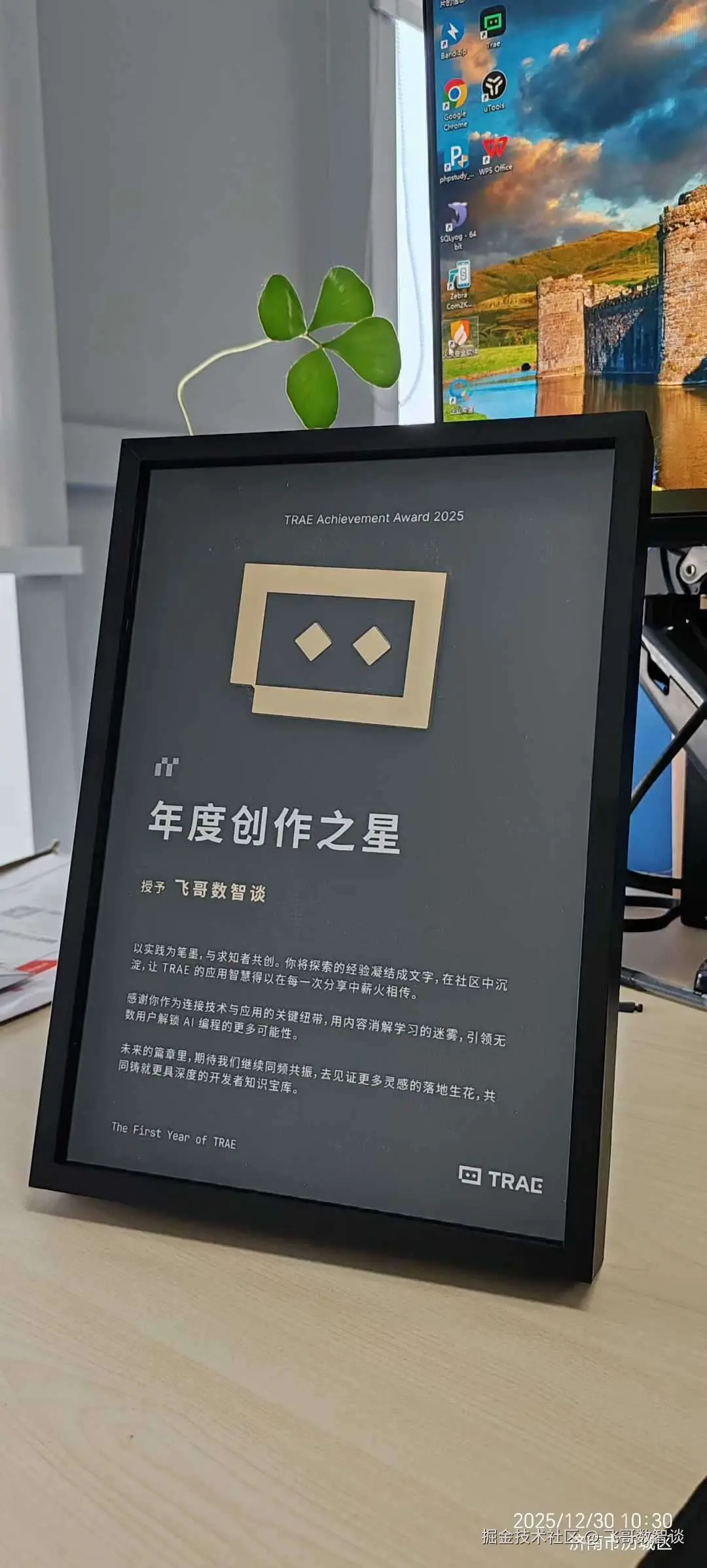 今天有一个好消息和大家分享:TRAE 官方的两个证书收到了------"年度社区突出贡献奖 "和"年度创作之星"。