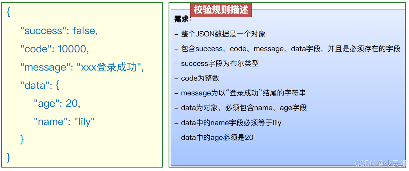 **概念:**校验接⼝返回响应结果的全部字段(更进一步的断言,断言只能校验字段的值。)